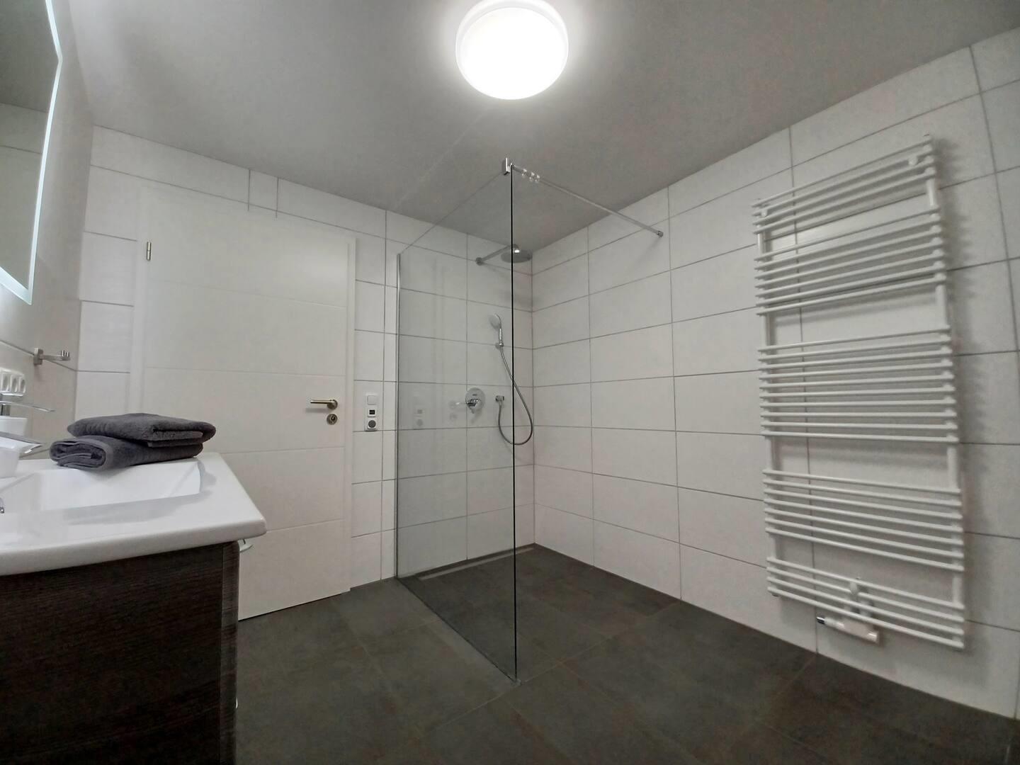 Das Badezimmer ist eine moderne Wohlfühloase mit einer großen begehbaren Regendusche (1,10 x 1,20 m).