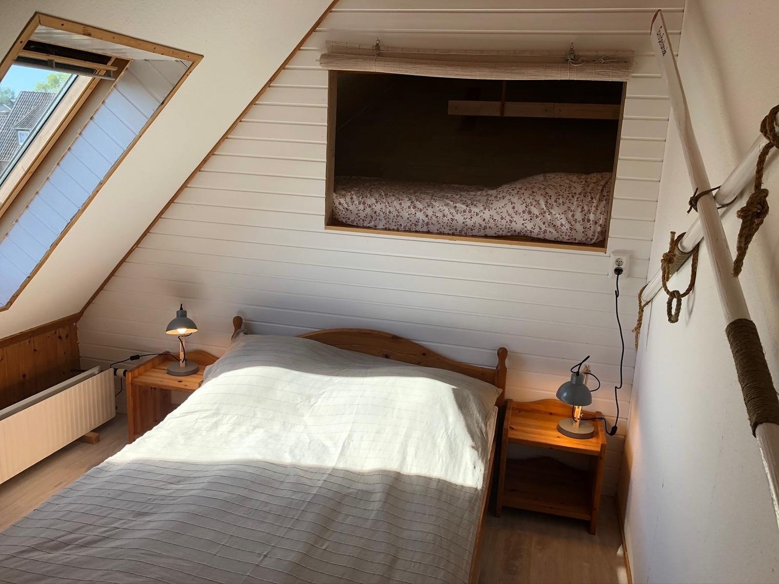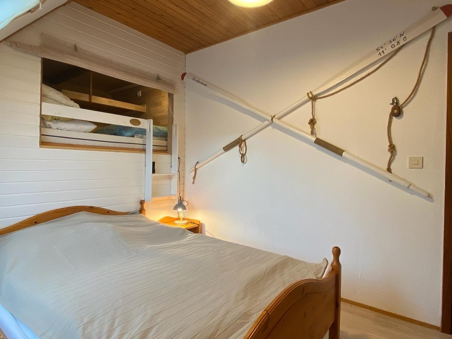Das Schlafzimmer ist mit Doppelbett, Babybett und Kleiderschrank ausgestattet, das Fenster verfügt über einen Insektenschutz und Verdunkelungsrollos. In einem Alkoven über dem Doppelbett - liebevoll die Koje genannt - (siehe Bilder) findet ein älteres Kind eine spannende Schlafgelegenheit. Bettwäsche wird selbstverständlich entsprechend der Gästeanzahl zur Verfügung gestellt.