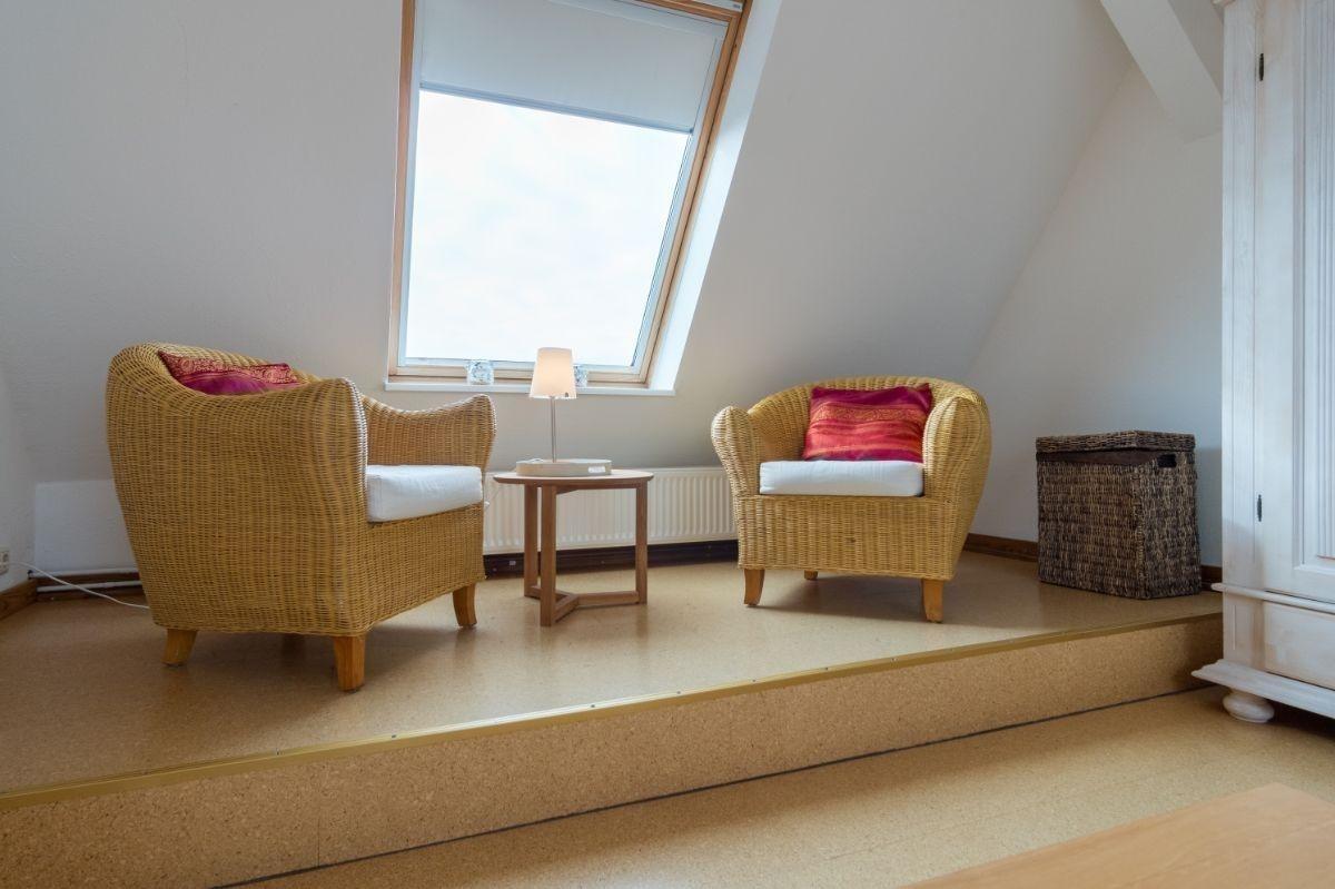 Urlauben Sie auf großzügigen 70 m² (1. Etage & Dachgeschoss) im "Haus an der Mole". Das große Wohn-Esszimmer ist mit einer gemütlichen Sofaecke und TV ausgestattet. Im Essbereich finden bequem drei Personen Platz. Der angrenzende Küchenbereich ist, für den Urlaubsbedarf, voll ausgestattet. Ein Backofen und ein Geschirrspüler gehören ebenso dazu, wie die Kaffeemaschine, der Wasserkocher und ein Toaster. Geschirr und Besteck sind ausreichend vorhanden. Auf der gleichen Etage befindet sich das kleinere Schlafzimmer mit einem Einzelbett. Das größere Schlafzimmer verfügt über ein komfortables Doppelbett und einen großen Kleiderschrank. Wie das Tageslichtbad mit Dusche und Badewanne, befindet sich das große Schlafzimmer im Dachgeschoss.