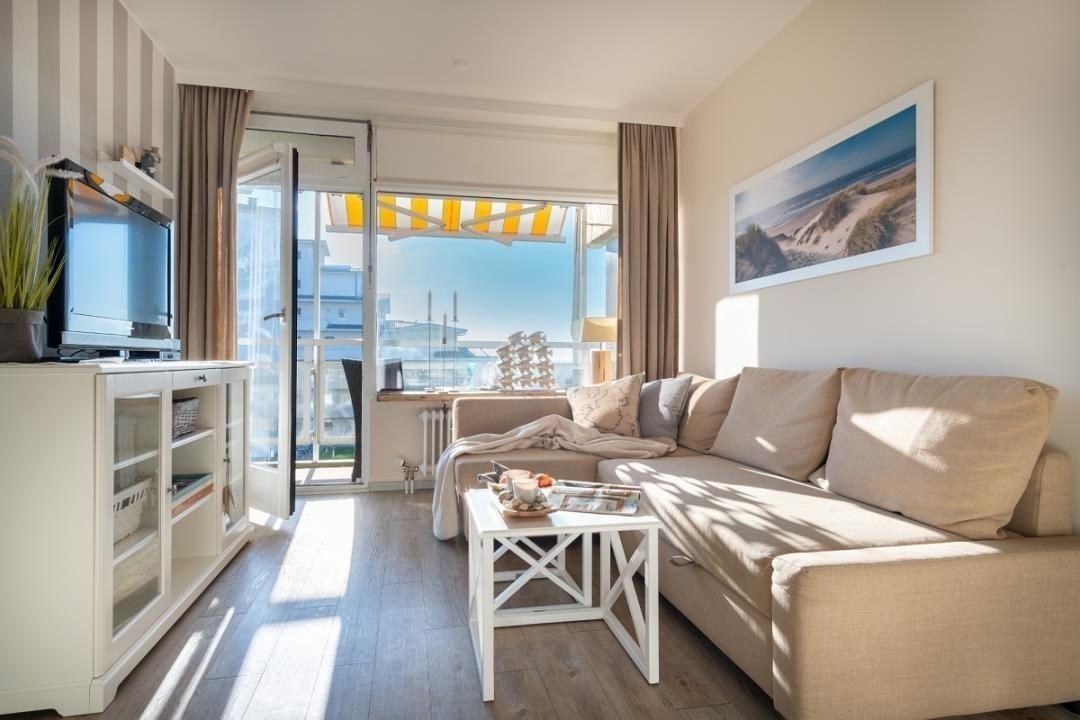 Die 35m²-Wohnung befindet sich in der 2. Etage im Haus "Belvedere" am Südstrand und wurde zuletzt 2020 modernisiert.