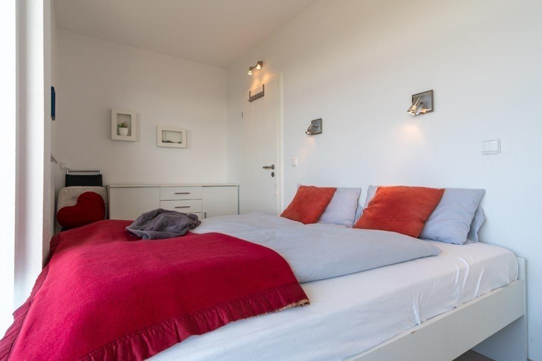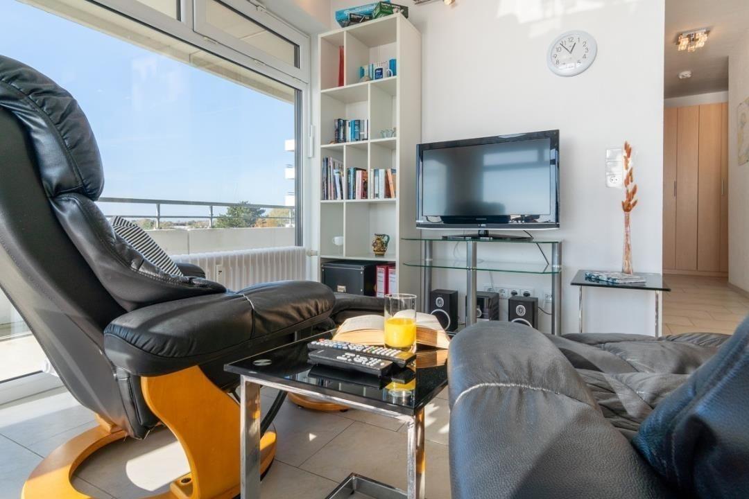 Die modernisierte 2-Zimmer-Wohnung verfügt über einen großzügigen Wohn-Schlafbereich mit einer gemütlichen Sofaecke (Schlafsofa) mit Flatscreen-TV und der Essecke für vier Personen. Der offene Küchenbereich ist, für den Urlaubsbedarf, voll ausgestattet. Außerdem stehen Ihnen noch eine Mikrowelle und ein Backofen zur Verfügung. Das angrenzende Schlafzimmer verfügt über ein komfortables Doppelbett. Das ebenfalls modernisierte Badezimmer verfügt über eine Dusche mit Glastrennwand und einem leicht erhöhten Einstieg.