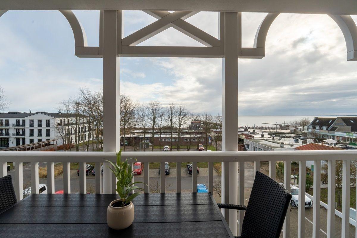 Vom Wohnzimmer aus gelangen Sie auf den Balkon mit traumhaften Blick zum Strand und zur Ostsee.