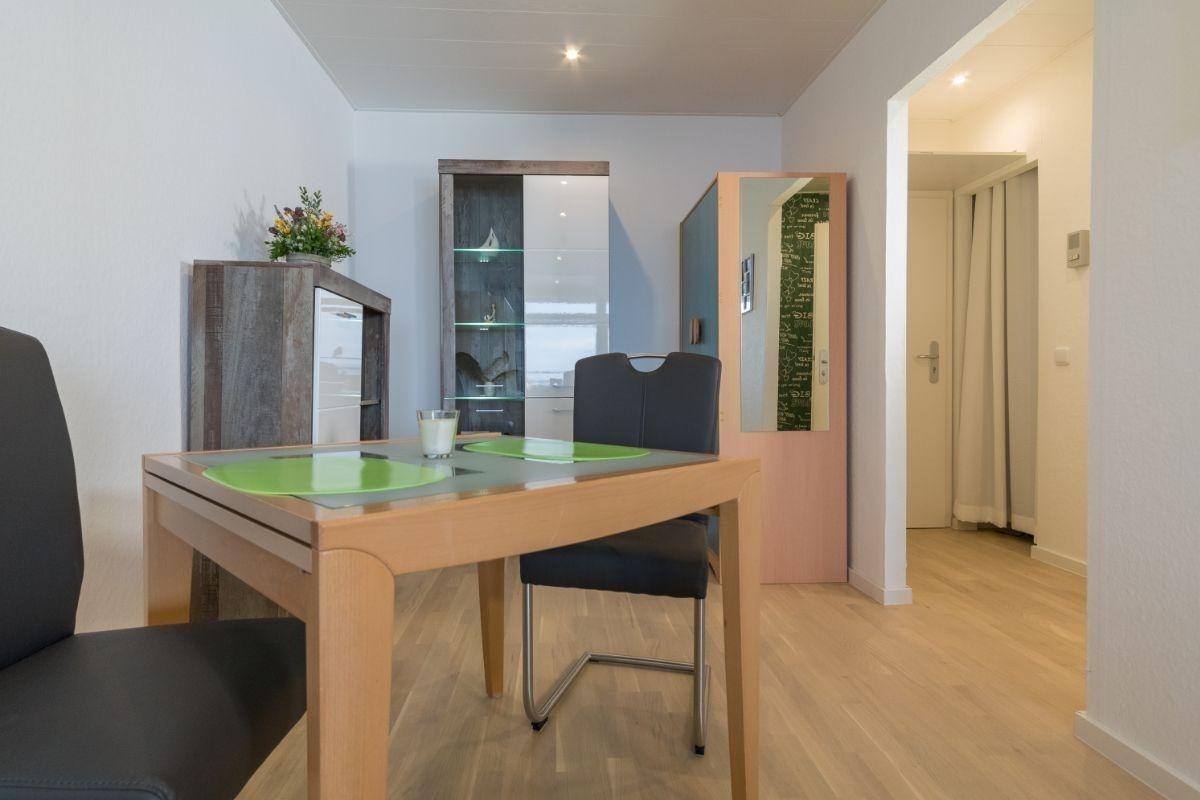 Die modernisierte 47m²-Wohnung in der 4. Etage im Haus 1 der Anlage "Vier Jahreszeiten" am Südstrand verfügt über einen großzügigen Wohn-Schlafbereich mit einem komfortablen Doppelschrankbett im hinteren Bereich, einer gemütlichen Sofaecke mit Flatscreen-TV und der Essecke für zwei Personen.