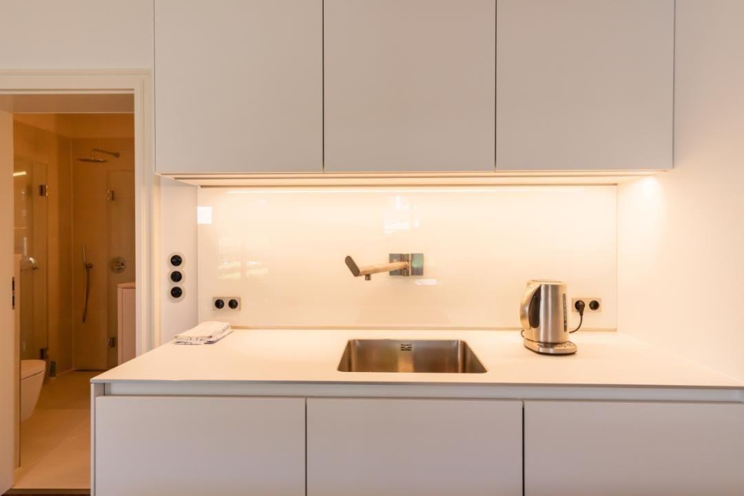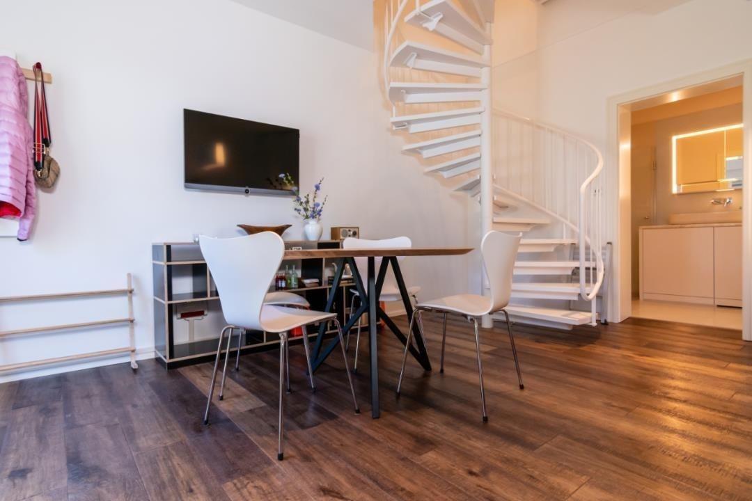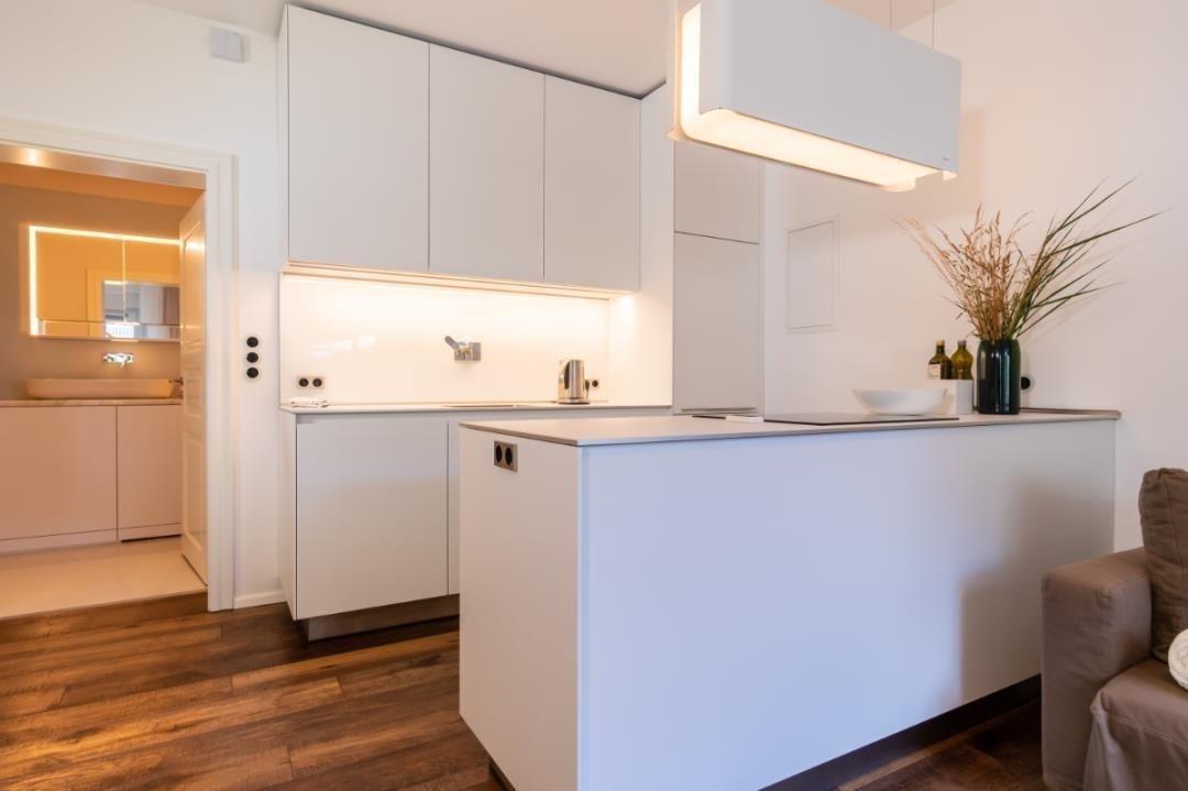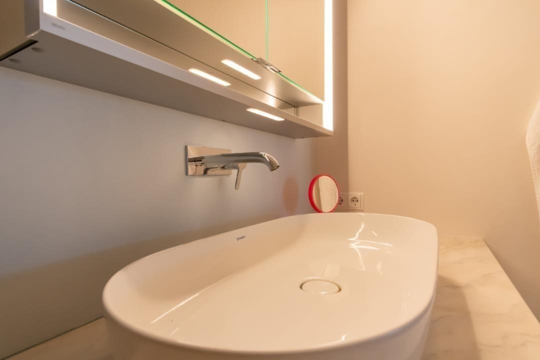 Die Wohnung wurde 2020 aufwendig modernisiert. Der Wohnraum verfügt über ein gemütliches Sofa, einen Flatscreen TV, sowie einen Esstisch für vier Personen und dem angrenzenden offenen Küchenbereich. Die große und geräumige Bulthaup-Küche hat alles, was das Herz begehrt: Geschirrspüler, Kühlschrank mit großem Gefrierteil, Backofen mit Mikrowellenfunktion.