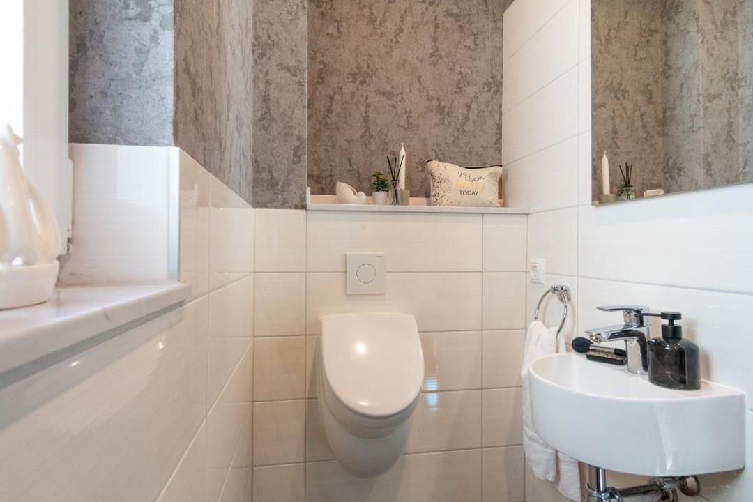 Das Gäste-WC und der Hauswirtschaftsraum mit Waschmaschine und einem Kühlschrank für Getränke sind ebenfalls im EG angesiedelt. Die drei Schlafzimmer befinden sich im Dachgeschoss. Das Hauptbadezimmer befindet sich ebenfalls in der 1. Etage und ist mit einer Dusche mit Glastrennwand ausgestattet.