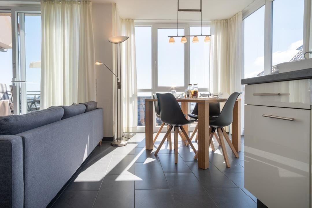 Die 58m²-Wohnung befindet sich in der 3. Etage in der Anlage "Strandpark" und verfügt über einen Südbalkon. Der lichtdurchflutete Wohnbereich ist mit einer gemütlichen Sofaecke, TV, Spielen, einem Kaminofen u.v.m. ausgestattet. Der offene Küchenbereich ist, für den Urlaubsbedarf, voll ausgestattet. Eine Kaffeemaschine gehört ebenso dazu, wie der Wasserkocher und ein Toaster. Geschirr und Besteck sind ausreichend vorhanden. Außerdem stehen Ihnen noch ein Backofen, Geschirrspüler und eine Mikrowelle zur Verfügung. In beiden Schlafzimmern finden Sie jeweils ein komfortables Doppelbett (2*90*200cm).