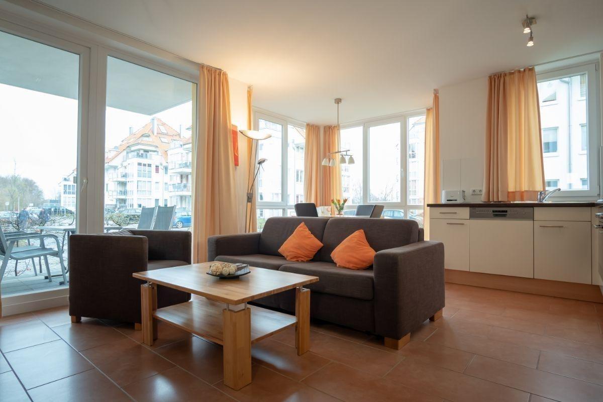 Die 45m²-Wohnung befindet sich im Erdgeschoss in der Anlage "Strandpark" und verfügt über eine Nordterrasse. Der lichtdurchflutete Wohnbereich ist mit einer gemütlichen Sofaecke (Schlafsofa), TV, Spielen, einem Kaminofen u.v.m. ausgestattet. Der offene Küchenbereich ist, für den Urlaubsbedarf, voll ausgestattet. Eine Kaffeemaschine gehört ebenso dazu, wie der Wasserkocher und ein Toaster. Geschirr und Besteck sind ausreichend vorhanden. Außerdem stehen Ihnen noch ein Backofen, Geschirrspüler und eine Mikrowelle zur Verfügung. Im Elternschafzimmer finden Sie ein komfortables Doppelbett (2*90*200cm). Ein Hochstuhl und ein Kinderreisebett steht für Ihr Baby kostenfrei zur Verfügung, das Reisebett kann nur im Wohnzimmer aufgestellt werden.