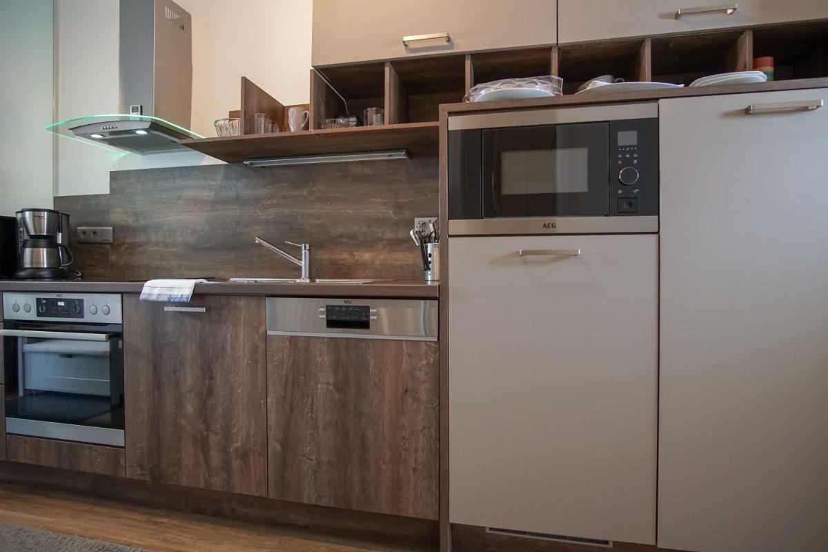 Der offene Küchenbereich ist, für den Urlaubsbedarf, voll ausgestattet. Eine Kaffeemaschine gehört ebenso dazu, wie der Wasserkocher und ein Toaster. Geschirr und Besteck sind ausreichend vorhanden. Ergänzt wird die Ausstattung mit einem Backofen, Geschirrspüler und einer Mikrowelle. Das Badezimmer verfügt über eine große Dusche mit Glastrennwand.
