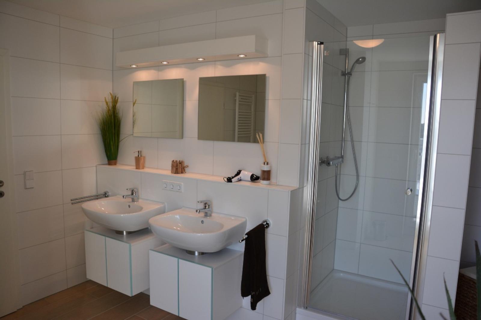 Sie haben ebenfalls eine edle Dusche und zwei neumodische Waschbecken.