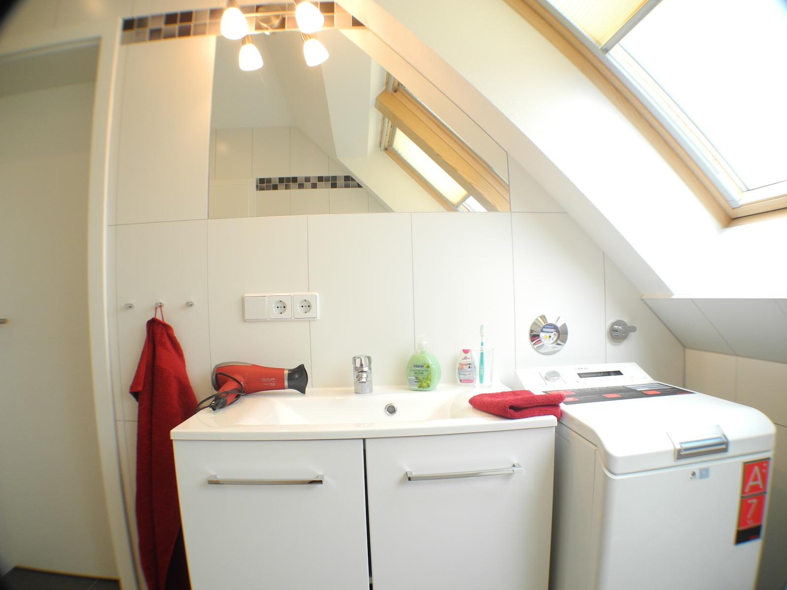 In unserem Wellnessbad finden Sie eine Whirlpool-Wanne und eine Wellnessdusche. Hier können Sie sich komplett entspannen und es sich gut gehen lassen. Eine Waschmaschine steht Ihnen ebenfalls zur Verfügung.