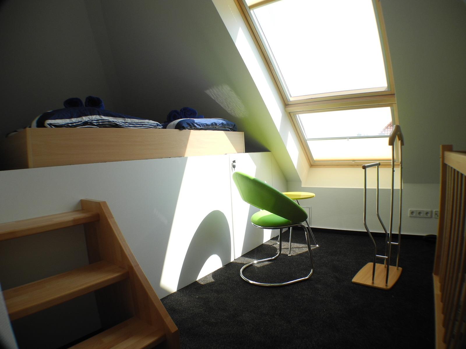 Das zweite Schlafzimmer, ebenfalls mit Doppelbett und TV, finden Sie auf der offenen Gallerie (Dachschräge) im Obergeschoss, welches Sie über die Holztreppe im Wohnbereich erreichen. Hinweis für Familien: Die Treppe kann nicht gesichert werden.