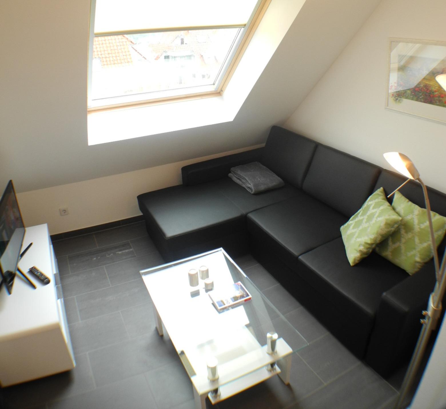 Unsere Penthouse-Wohnung befindet sich im vierten Obergeschoss und verteilt sich auf zwei Ebenen. Ein Fahrstuhl ist im Haus vorhanden. Nach dem Betreten der Wohnung gelangen Sie in unserem gemütlichen Wohnbereich. Im Wohnbereich steht Ihnen eine großzügige Sitzecke mit Fernseher zur Verfügung und Sie können direkt auf den Essbereich mit der offenen Küche schauen.