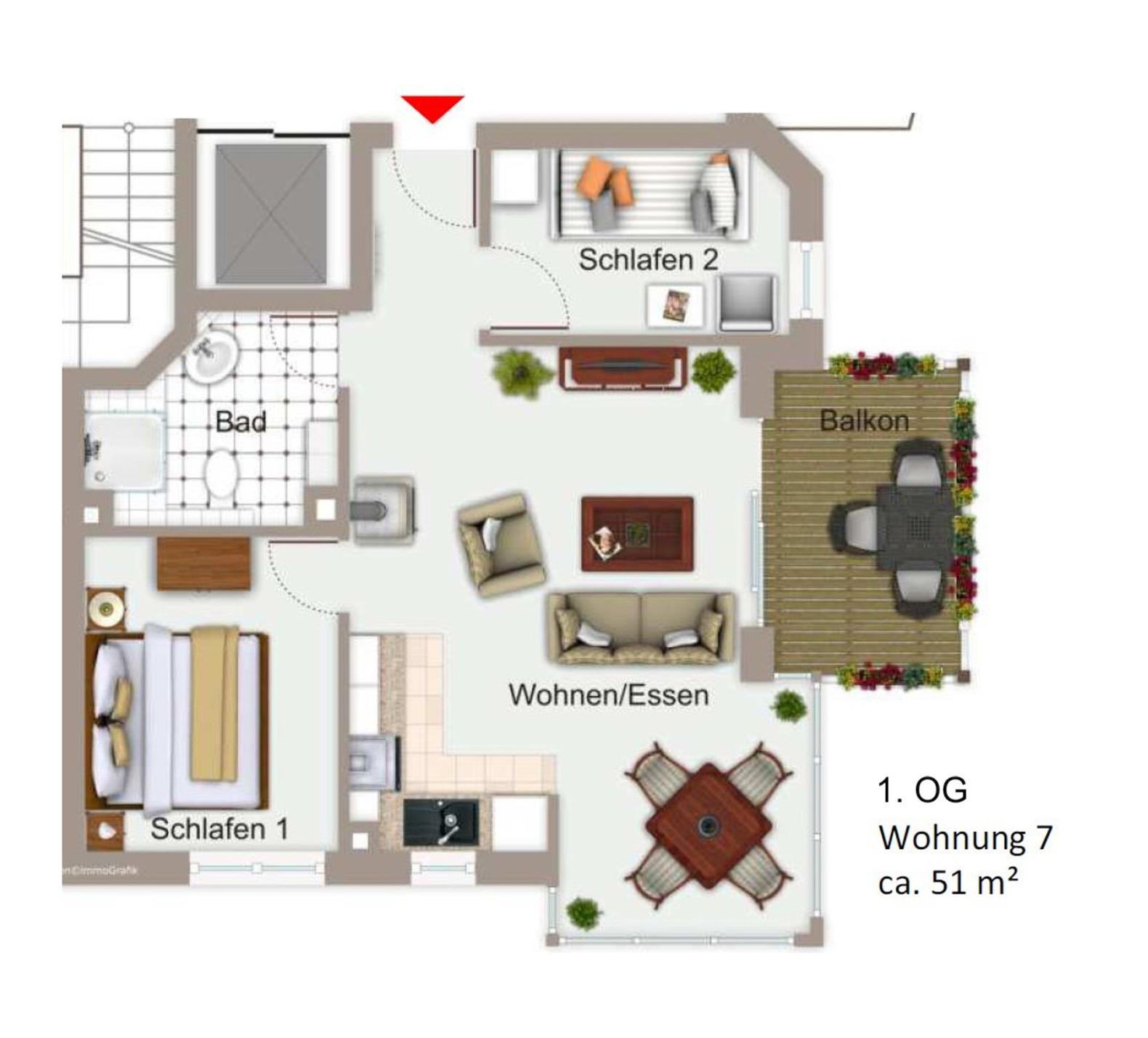 Die Wohnung befindet sich im 1. Stock. Ein Fahrstuhl ist im Haus vorhanden. Der Balkon ist nach Nord-Osten ausgerichtet.