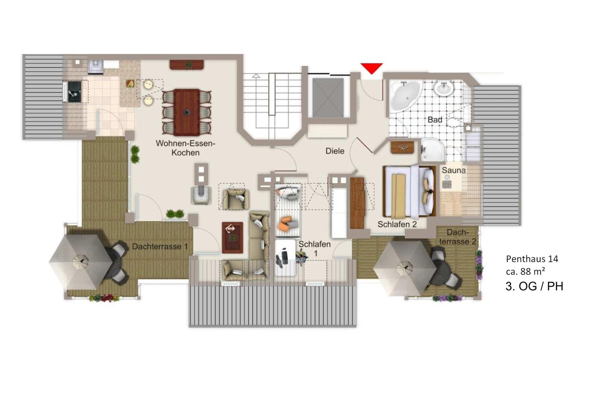'Ostseebrise 14'. Unsere traumhafte Penthouse-Wohnung befindet sich im dritten Obergeschoss des Hauses 'Ostseebrise' im Strandpark Großenbrode und ist nur ungefähr 100 Meter vom feinen Sandstrand entfernt.