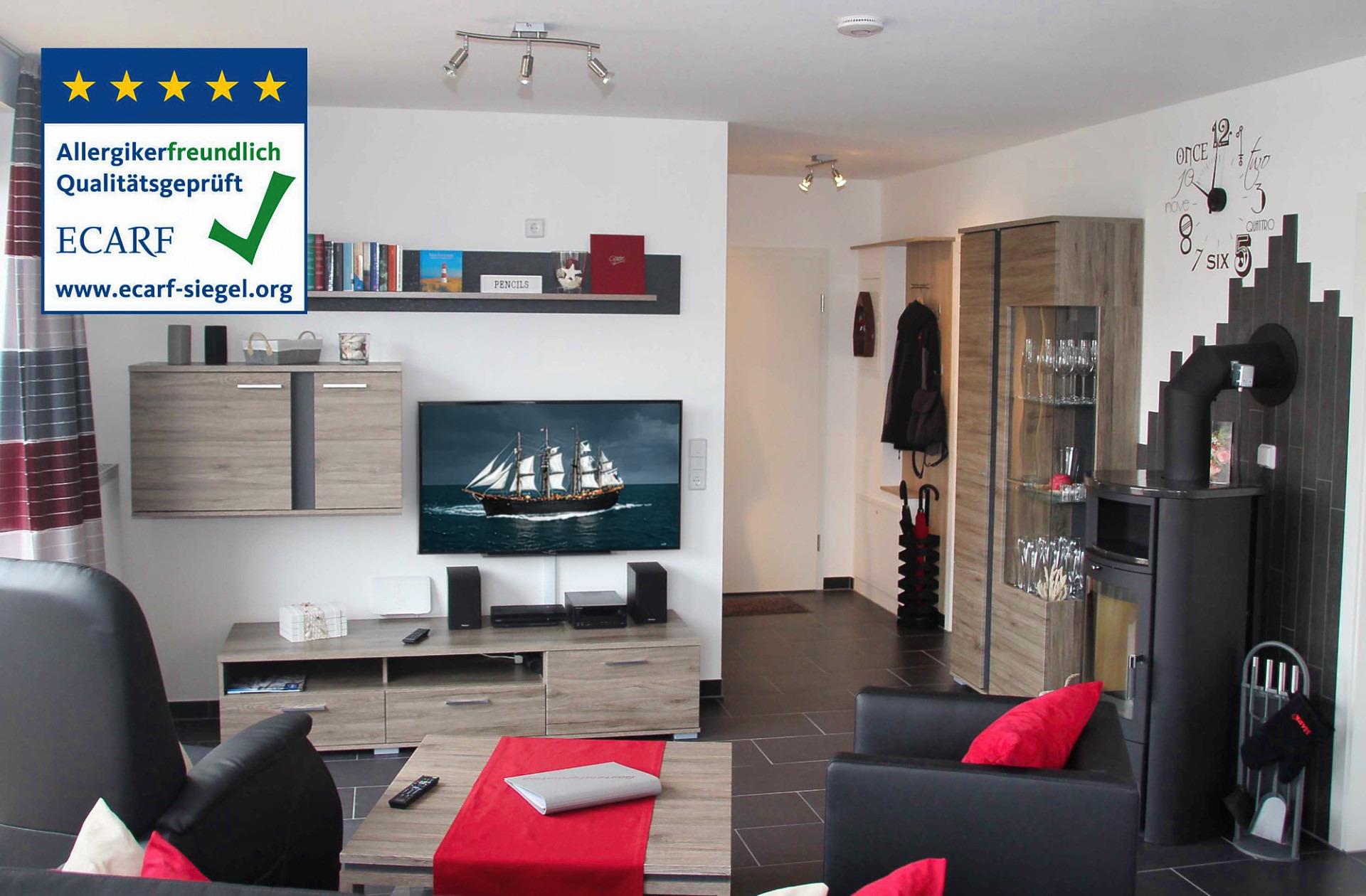 Unser Feriendomizil ist von der ECARF als allergikerfreundlich zertifiziert worden. Wir bieten Ihnen eine rauch- und haustierfreie Unterkunft mit teppichfreien Böden oder kurzflorigen Bodenbelägen. Wir stellen Ihnen zur Milbenreduktion Schutzbezüge für Matratzen, Bettdecken und Kopfkissen zur Verfügung. Unser Staubsauger verfügt über einen speziellen Filter.