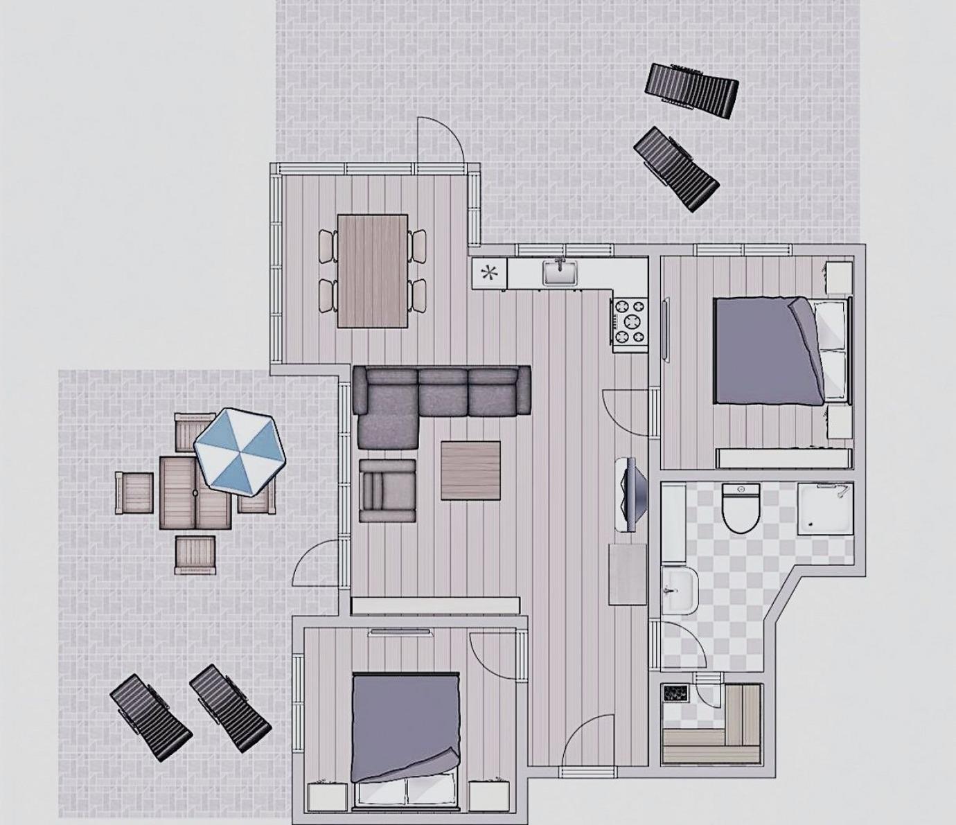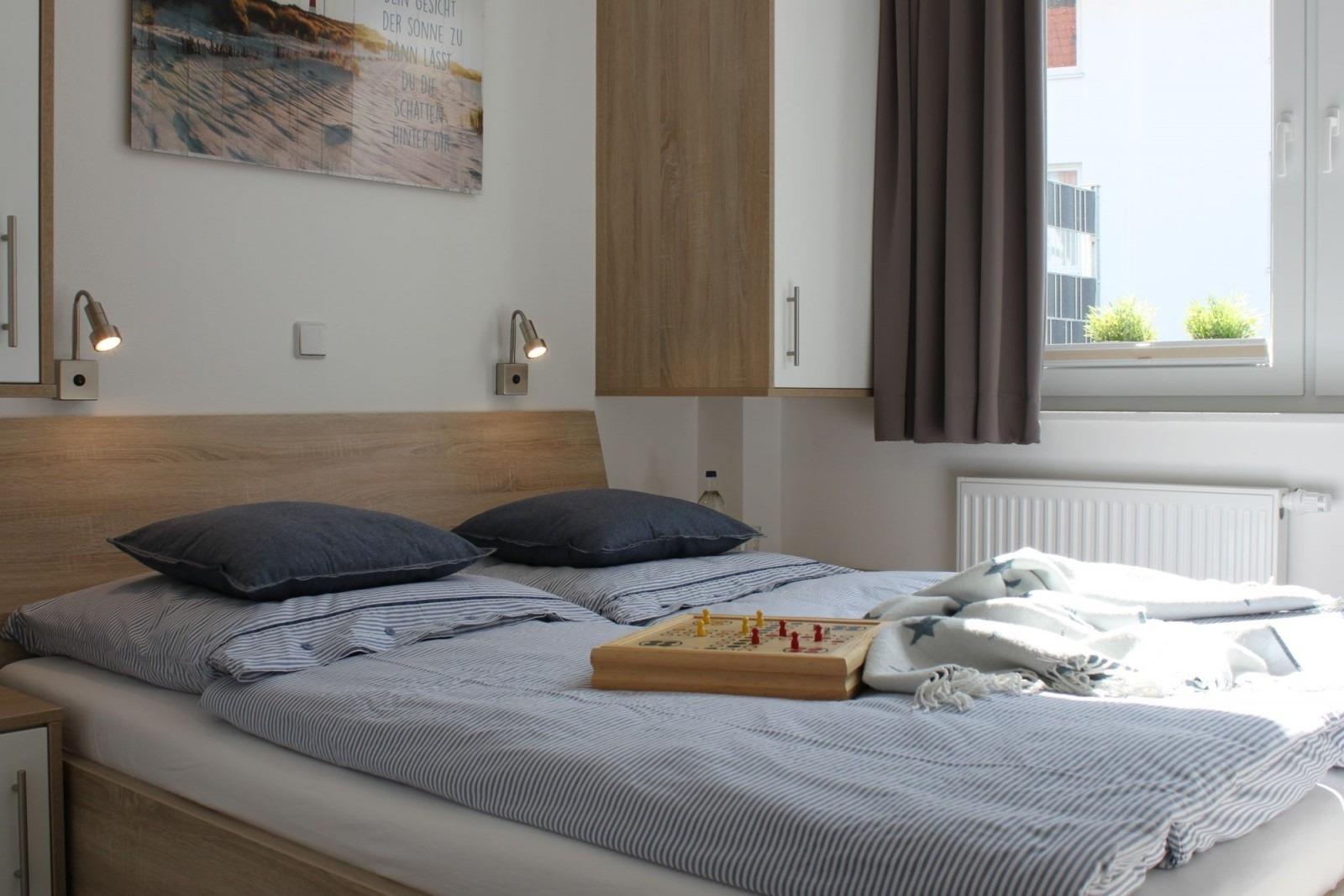 Zwei Schlafzimmer mit Doppelbetten (1,60 x 2,00 m) und Verdunklungsgardinen spenden Ihnen erholsamen Schlaf.