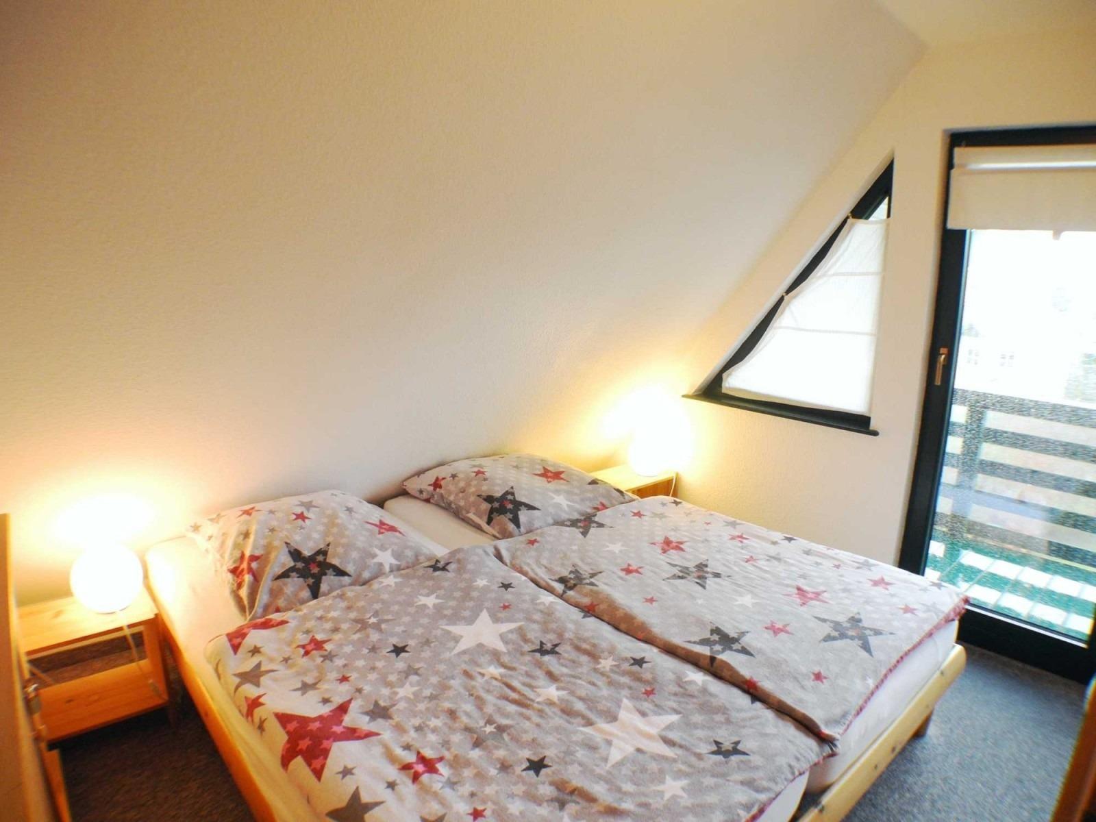 Das große Familien-Schlafzimmer im Obergeschoss verfügt über ein Doppelbett und zwei Einzelbetten sowie ein Babybett. Ein großer Kleiderschrank dient als Sichtschutz. Von hier haben Sie auf zwei Seiten Zugang zum Balkon.