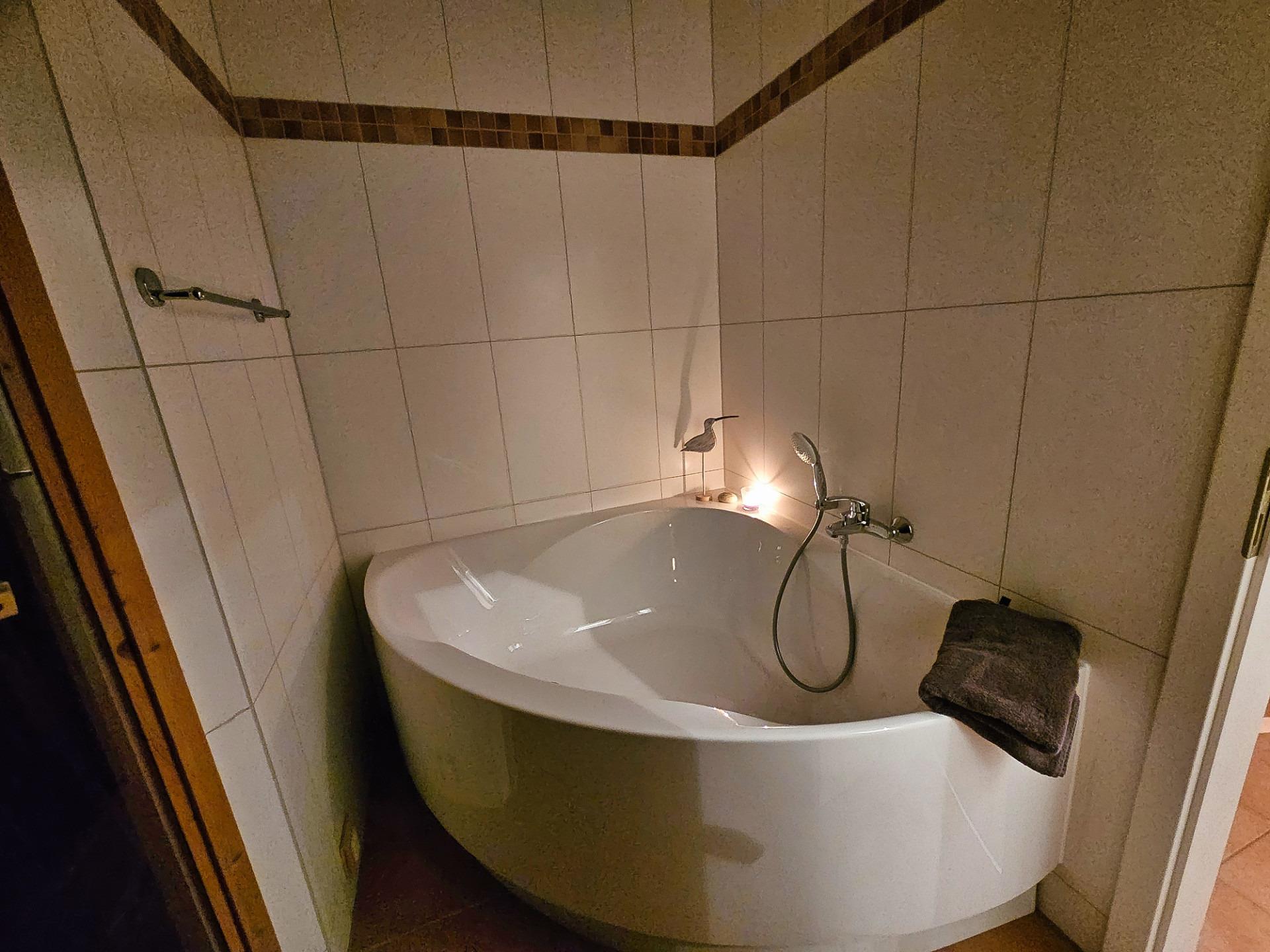 Das geräumige Badezimmer ist mit einer Eckbadewanne, einer Sauna, sowie einer Dusche und einer Waschmaschine/ -trockner ausgestattet.