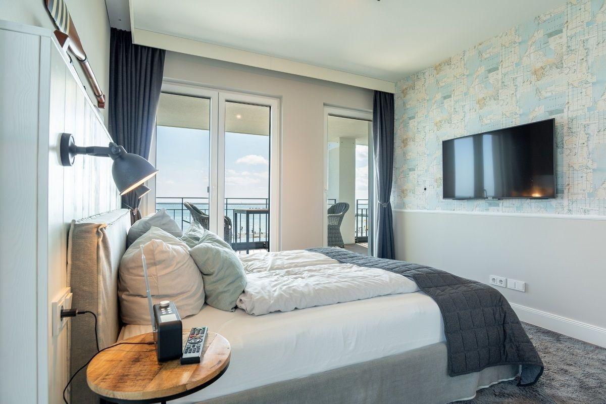 Aus dem modernen Wohnzimmer mit bodentiefen Fenstern haben Sie einen direkten Blick aufs Meer. Fühlen Sie sich rundum wohl mit einer komfortablen Doppelschlafcouch (140*200cm) und einem Smart-TV (Internet/WLAN/Netflix kostenlos). Im Essbereich finden bequem 4 Personen zum Schlemmen Platz. Die angrenzende offene Küche ist neben einem Induktionsherd mit allen Annehmlichkeiten vollumfänglich ausgestattet, um kulinarische Köstlichkeiten zu bereiten. Genießen Sie im Schlafzimmer schon morgens beim Aufwachen mit Ost-Sonne aus dem Bett den wunderbaren Meerblick. Lichtdurchflutet mit drei sonnenschutzverglasten Fenstern verfügt es über ein hochwertiges Doppelbett (191*213cm) und ebenfalls einem Smart-TV sowie Kleiderschränke. Beide Schlafbereiche können verdunkelt werden. Jeweils eine Tür verfügt über einen Insektenschutz. Im tageslichthellen modernen Wellnessbad erwartet Sie eine ebenerdige Regendusche mit Glastrennwand sowie ein Kosmetikspiegel und ein Handtuchheizkörper. Optisch ansprechend und praktisch in einem Einbauschrank integriert sind hier Waschmaschine und Trockner untergebracht. Die angrenzende Sauna glänzt mit einem direkten Ausgang auf den Balkon und , ein Wohlfühlort für Meer- und Wellnessverliebte. Sowohl aus der Sauna, aus dem Wohnzimmer als auch vom Schlafzimmer aus, gelangen Sie auf den Eckbalkon. Zum Relaxen lädt dort ein Strandkorb, eine Outdoor-Sitzgruppe mit Auflagen für 4 Personen und 2 Deck-Chairs ein. Für die sportbegeisterten stehen außerdem noch zwei Strand-Yoga-Matten zur Verfügung.