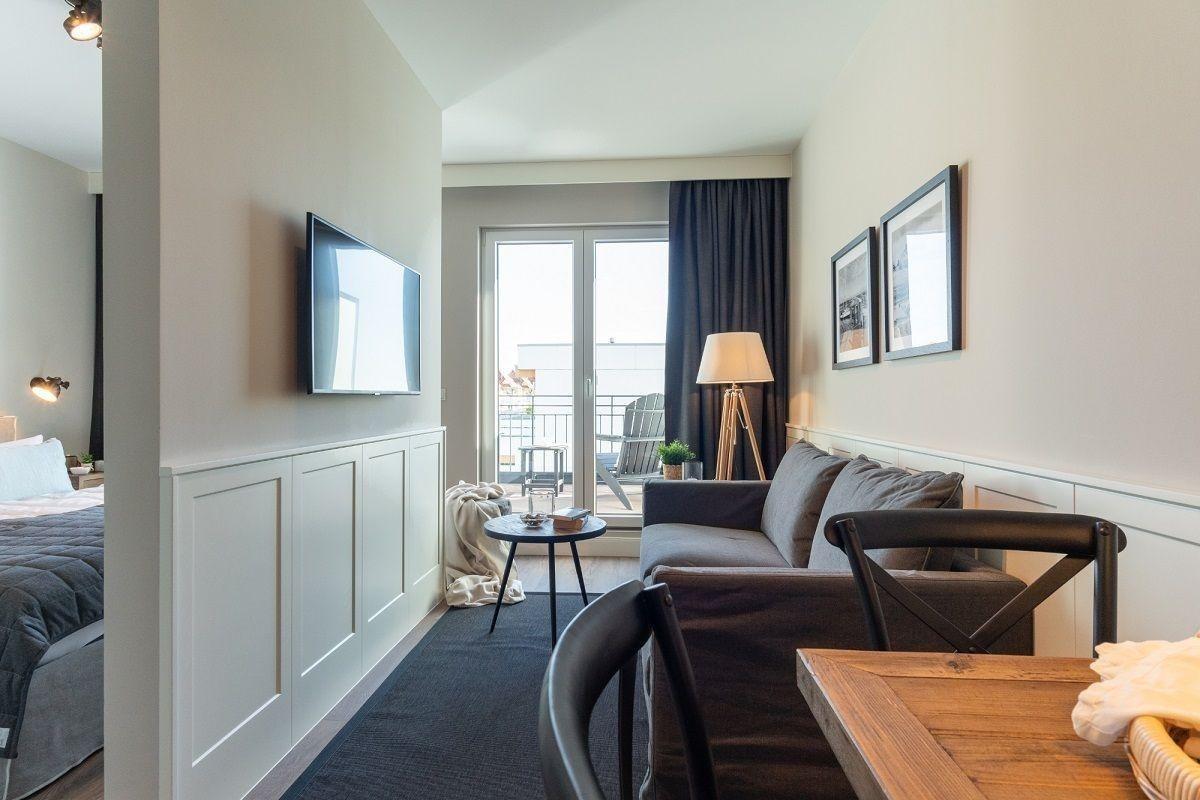 Hierbei handelt es sich um eine stylische Studiowohnung für 2 Personen mit WLAN, Balkon seitlicher Meerblick, Geschirrspüler, Doppelbett, und vielem mehr.