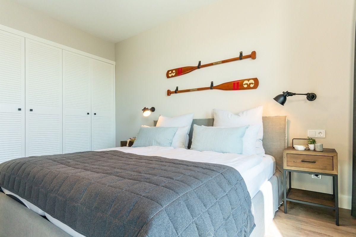 Das Doppelbett hat die Maße von ca. 180 x 200 cm und ist optisch vom restlichen Wohnbereich durch eine Wand getrennt.