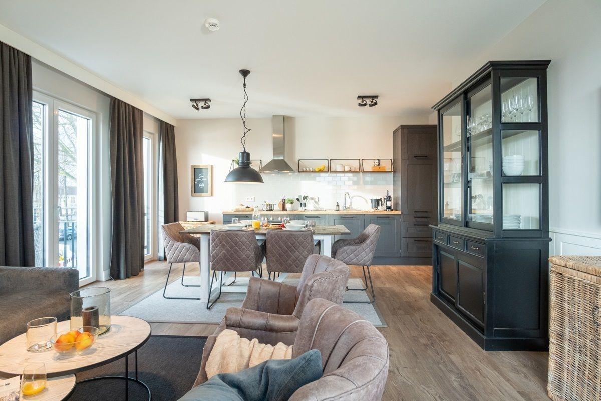 Unser helles und luxuriös eingerichtetes «Beach House» (vornehmlich Riviera Maison-Ausstattung) glänzt mit perfekter Süd-West-Lage und Meerblick aus allen Zimmern durch die bodentiefen Panoramafenster. Auf 82 qm finden Sie zwei Schlafzimmer, ein großes Wohn-Esszimmer mit voll ausgestatteter Küche sowie einem großzügigen Wellness-Badezimmer mit Sauna und ein zusätzliches Gäste-WC. Die zwei nach Süden ausgerichteten Schlafzimmer verfügen über ein großes französisches Doppelbett (1,80 x 2,10 m) beziehungsweise ein ausziehbares Kojenbett mit 1,80 x 2,00 m Liegefläche. Beide Schlafzimmer können verdunkelt werden und besitzen viel Stauraum und eine heimelige, stilvolle Atmosphäre. Im Wohnbereich befindet sich außerdem eine komfortable Schlafcouch (mit 1,40 x 2,00 m Liegefläche) für bis zu zwei weitere Personen. Die Wohnung ist damit für bis zu 6 Personen geeignet. Die familien- und Allergiker-freundliche Nichtraucher-Wohnung mit Fußbodenheizung bietet alles, was das Herz begehrt. Die große offene Wohnküche verfügt über alle wichtigen Küchengeräte, Essgeschirr, sowie Besteck, um kulinarische Highlights in geselliger Runde zu zaubern. Die Wohnung gilt zwar nicht als barrierefrei nach klassischen Standards, ist durch ihre großzügige Gestaltung aber auch für Menschen mit körperlichen Einschränkungen unter Nutzung von Hilfsmitteln komfortabel bewohnbar.