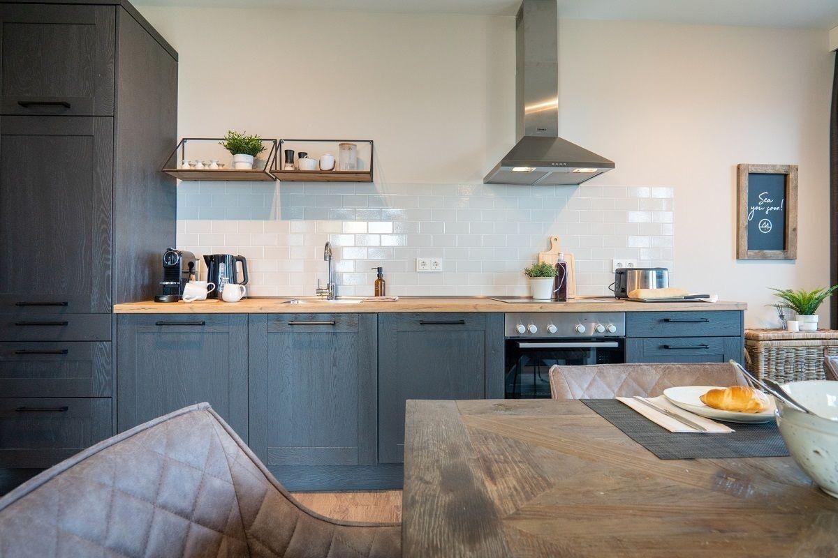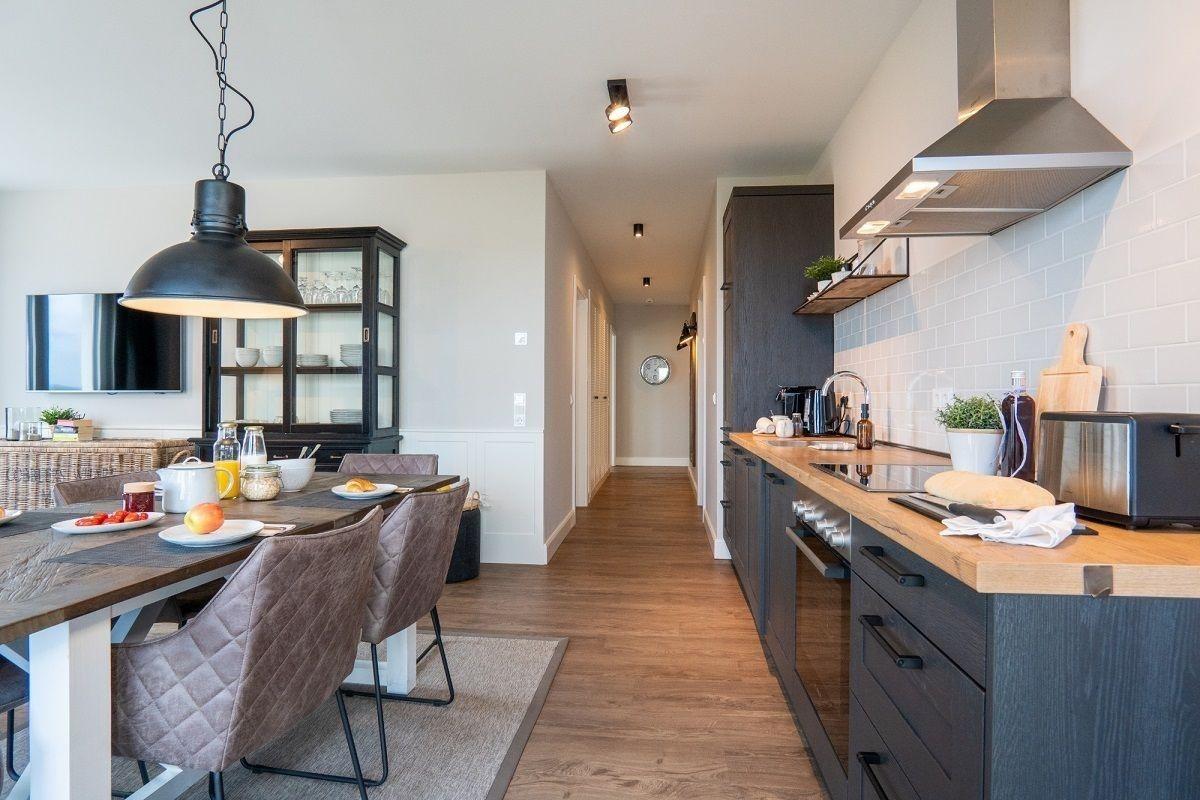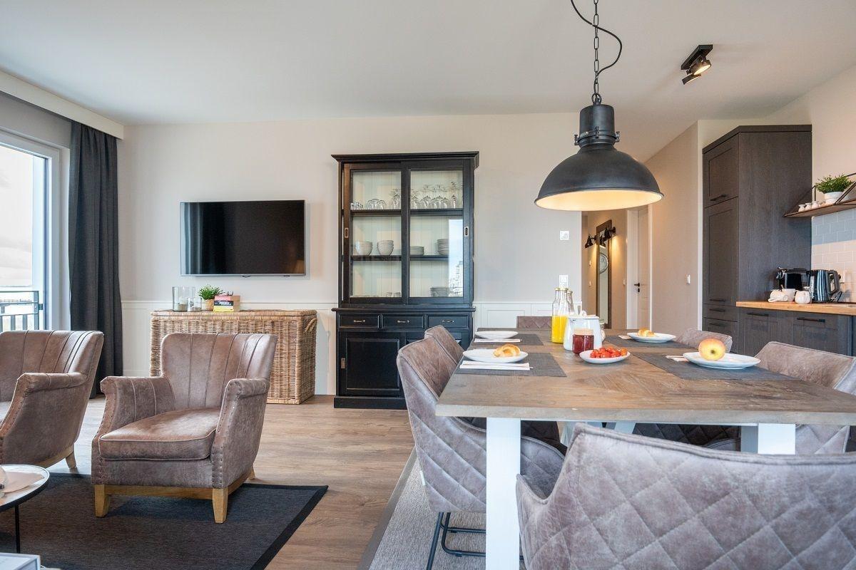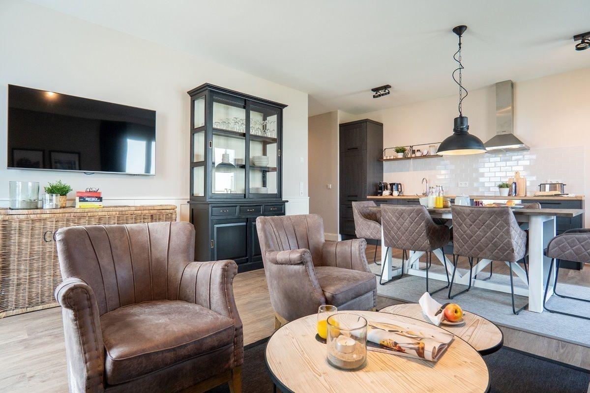 Der lichtdurchflutete Wohnbereich ist mit einer gemütlichen Sofaecke und einem Flatscreen-TV ausgestattet. Genießen Sie schon morgens beim Frühstück den herrlichen Ausblick zur See. Der offene Küchenbereich ist mit allen wichtigen Küchengeräten, Essgeschirr, sowie Besteck ausgestattet. Außerdem stehen Ihnen noch ein Backofen, ein Geschirrspüler und eine Nespressomaschine zur Verfügung.