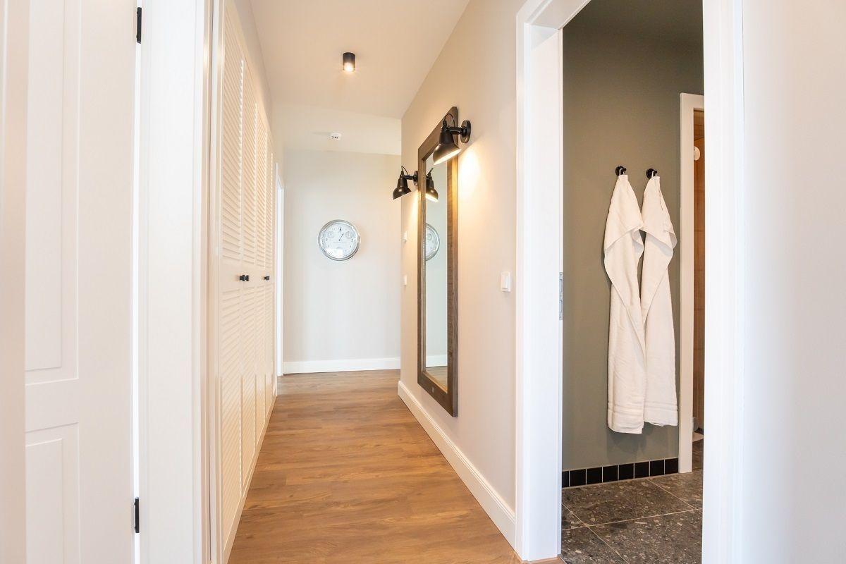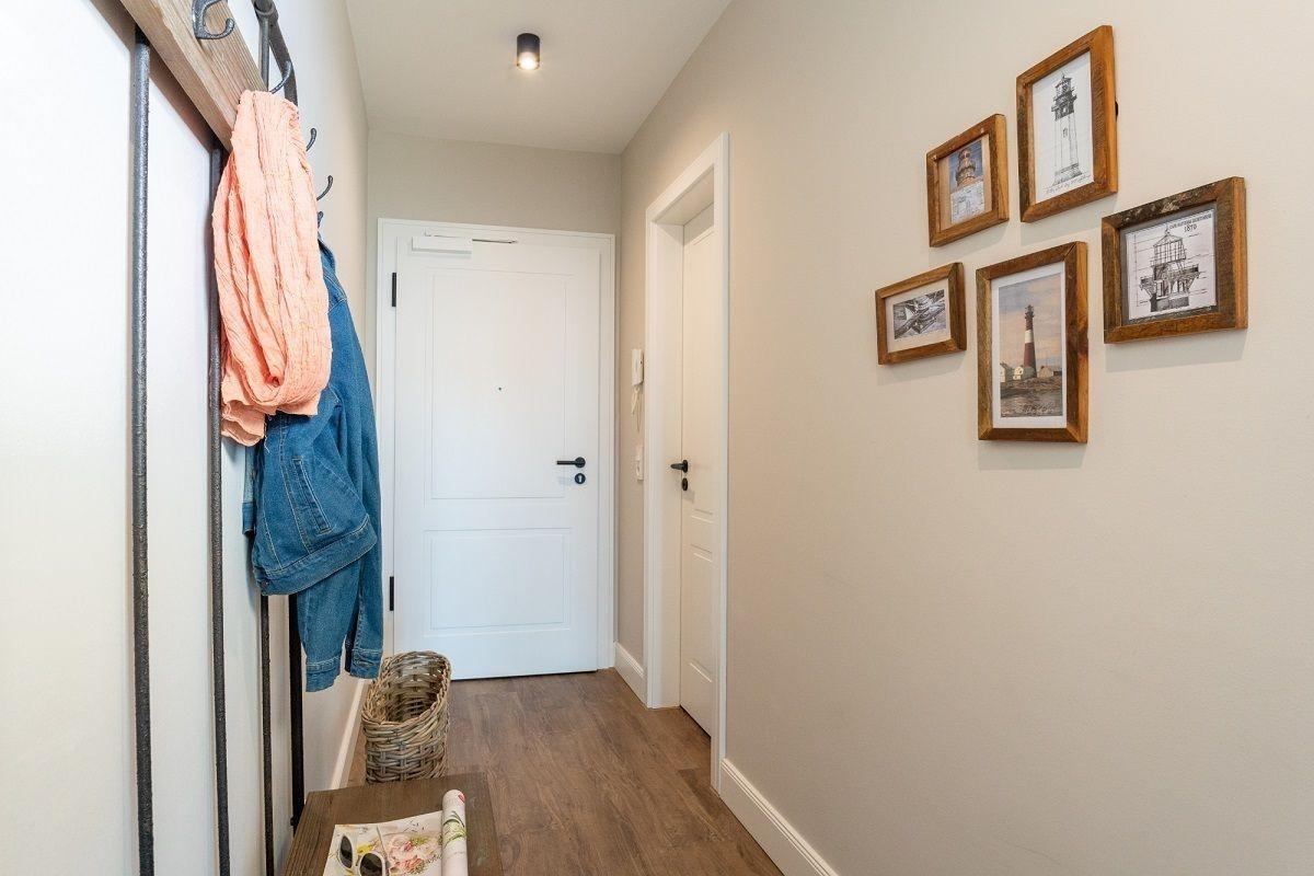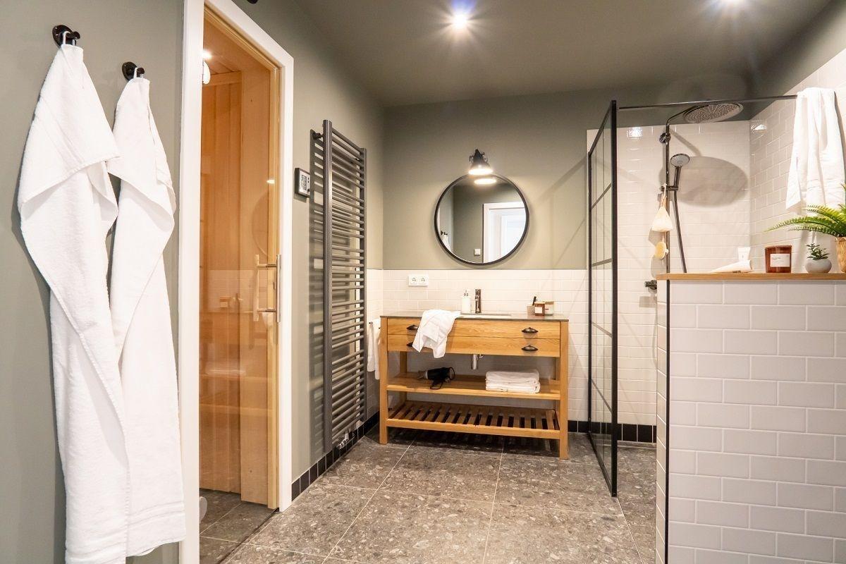 Das Bad verfügt über eine ebenerdige Dusche, einen Kosmetikspiegel und einen Handtuchheizkörper. Und an Schietwettertagen lädt die eigene Sauna zum Relaxen ein.