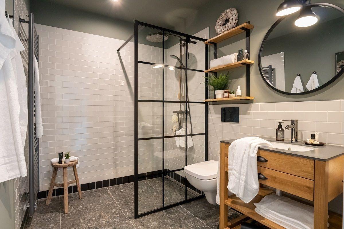 Das Bad verfügt über eine ebenerdige Dusche, einen Kosmetikspiegel und einen Handtuchheizkörper.