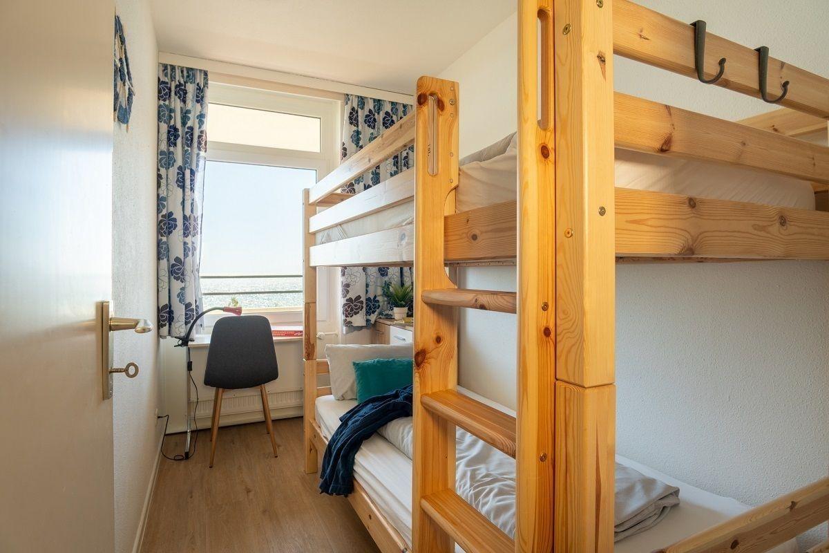 Die gemütliche 47m²-Wohnung in der fünften Etage verfügt über einen großzügigen Wohnbereich mit einem gemütlichen Schlafsofa (für Kinder geeignet), Flatscreen-TV und einer Essecke für vier Personen. Vom Wohnzimmer aus gelangen Sie auf den sonnigen Südbalkon. Der offene Küchenbereich ist, für den Urlaubsbedarf, voll ausgestattet. Eine Kaffeemaschine gehört ebenso dazu, wie der Wasserkocher und ein Toaster. Geschirr und Besteck sind ausreichend vorhanden. Das Appartement verfügt über ein separates Schlafzimmer - ausgestattet mit zwei Einzelbetten zusammengestellt zu einem Doppelbett.