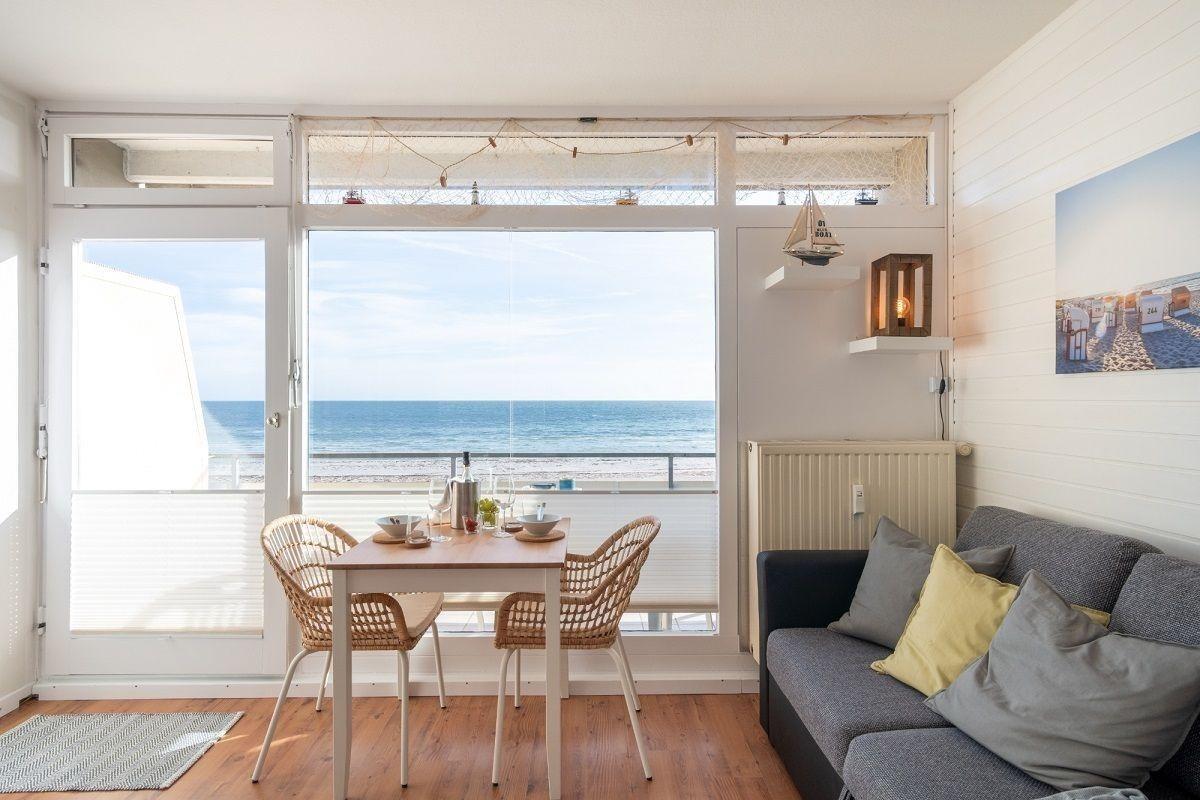 Die gemütliche 36m²- Wohnung befindet sich in der zweiten Etage im Haus C der Anlage "Bellevue". Der sonnige Wohnbereich verfügt über ein gemütliches Sofa und einen Flatscreen-TV. Die angrenzende Essecke bietet schon beim Frühstück einen herrlichen Blick zur Ostsee, so dass man schon morgens das Getümmel der Möwen beobachten kann. Das Schlafzimmer befindet sich im hinteren Bereich der Wohnung und wurde mit einem Doppelbett ausgestattet.