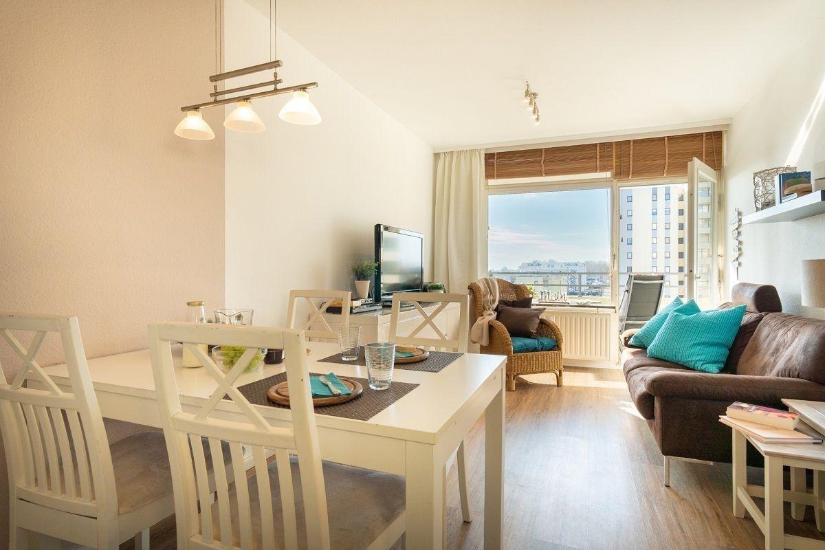 Die 47m²-Wohnung befindet sich in der dritten Etage. Der lichtdurchflutete Wohnbereich ist mit einer gemütlichen Sofaecke, TV, Spielen, u.v.m. ausgestattet. Das Kinderzimmer verfügt über ein Kojenbett, welches auf gleicher Ebene ausziehbar ist. Der Elternschlafbereich befindet sich im hintern Bereich des Wohnzimmers und hält ein bequemes Doppelbett für Sie vor.