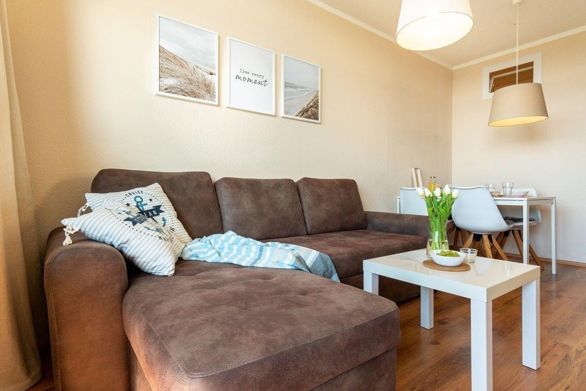 Die gemütliche 47m²-Wohnung befindet sich in der fünften Etage verfügt über einen hellen Wohnbereich mit einem gemütlichen Sofa, Flatscreen-TV und einer Essecke für vier Personen.
