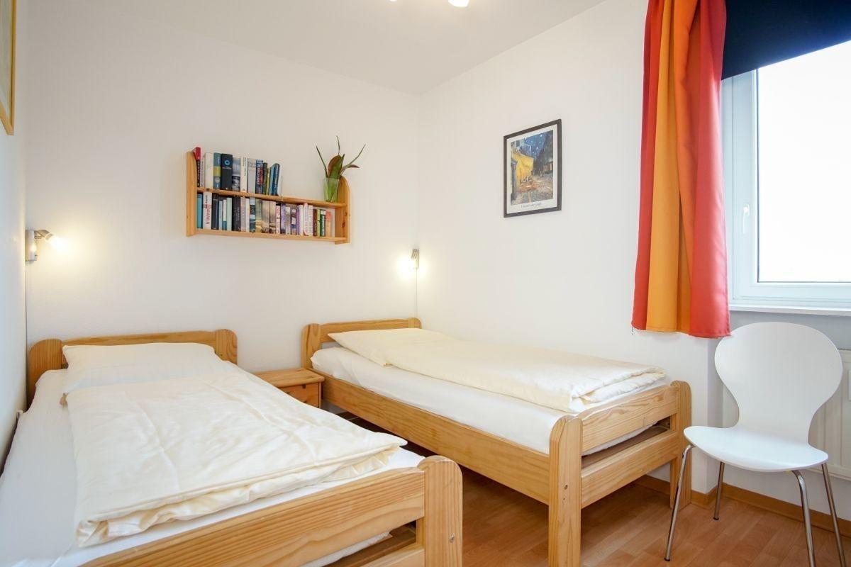 er offene Küchenbereich ist, für den Urlaubsbedarf, voll ausgestattet. Eine Kaffeemaschine gehört ebenso dazu, wie der Wasserkocher und ein Toaster. Geschirr und Besteck sind ausreichend vorhanden. Das Appartement verfügt über zwei separates Schlafzimmer: im Elternschlafzimmer warten zwei bequeme Einzelbetten auf Sie. Das Kinderzimmer hält ein Schlafsofa vor.