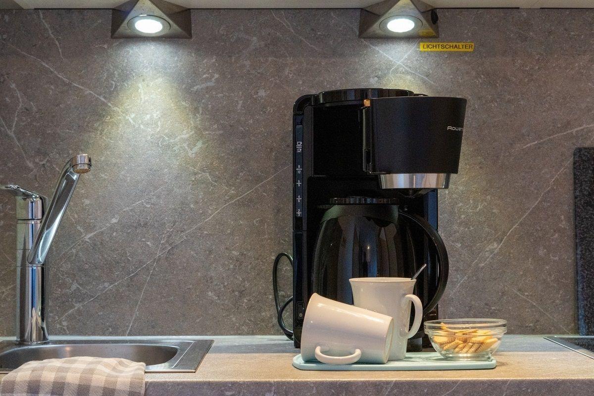 Der offene Küchenbereich ist, für den Urlaubsbedarf, voll ausgestattet. Eine Kaffeemaschine gehört ebenso dazu, wie der Wasserkocher und ein Toaster. Geschirr und Besteck sind ausreichend vorhanden. Außerdem sind noch ein Geschirrspüler und eine Mikrowelle vorhanden.