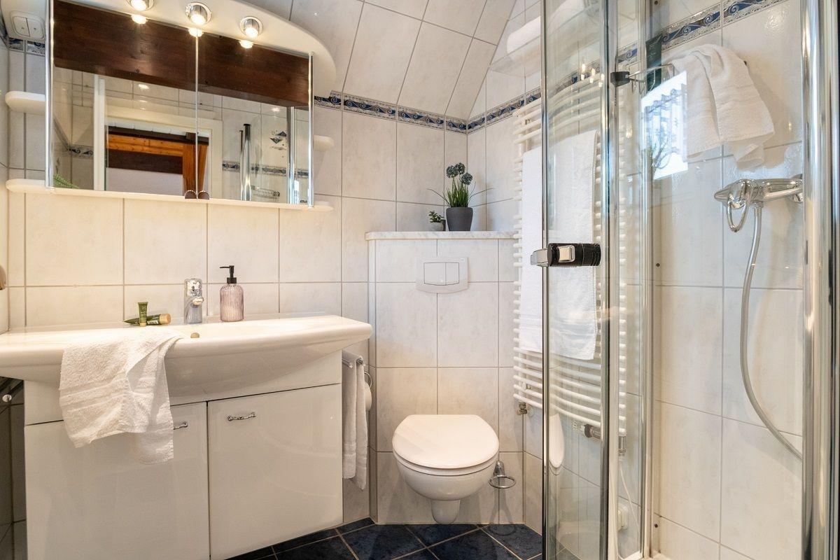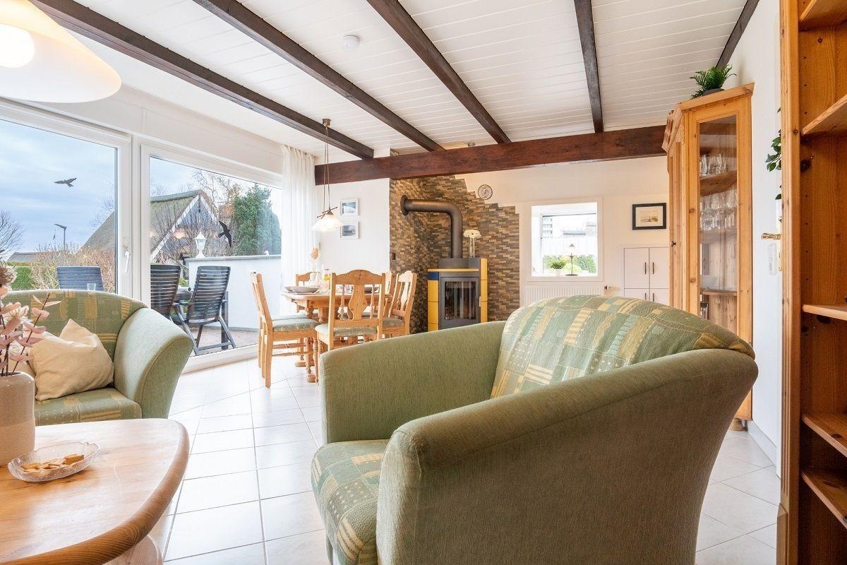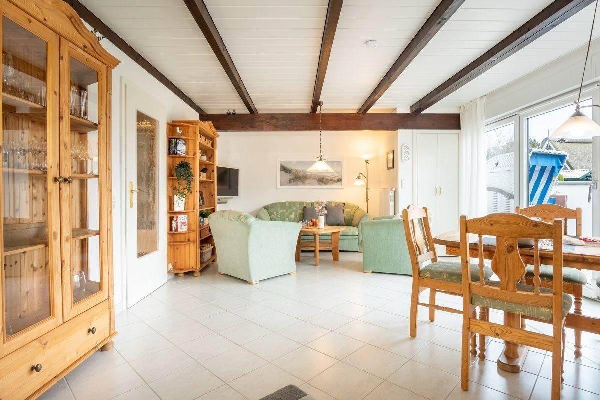 Im Erdgeschoss befindet sich das lichtdurchflutete Wohnzimmer mit Zugang zur Sonnenterrasse (Südlage), das Duschbad, der Küchen- und Essbereich, sowie eine kleine Abstellkammer. Über die Treppe gelangt man ins Obergeschoss mit einem großzügigen Schlafzimmer mit Doppelbett (ca. 2*100*200cm) und Kojenbett (ca. 2*80*200cm). Außerdem befindet sich im Obergeschoss noch ein Gäste-WC. Vom Schlafzimmer kann man sogar die Ostsee erspähen.