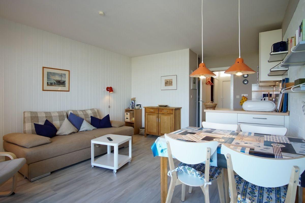 Die modernisierte 36m² Wohnung befindet sich im Erdgeschoss im Haus A der Anlage "Bellevue". Der sonnige Wohnbereich verfügt über ein gemütliches Schlafsofa (ca. 175*200cm), einen Flatscreen & Bluray-Player. Die angrenzende Essecke bietet schon beim Frühstück einen herrlichen Blick zu den Dünen, so dass man schon morgens das Getümmel der Möwen beobachten kann. Vom Wohnzimmer aus gelangen Sie auf die Südterrasse. Das Schlafzimmer verfügt über zwei Einzelbetten (ca. 90*190cm und 80*190cm).