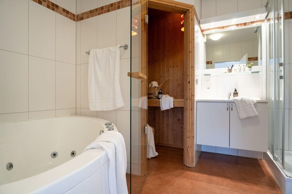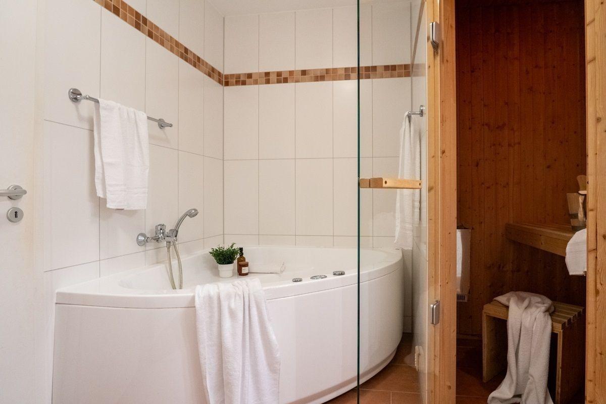Für Wellnessliebhaber steht eine Sauna bereit, um nach einem Tag voller Aktivitäten vollkommen zu entspannen.