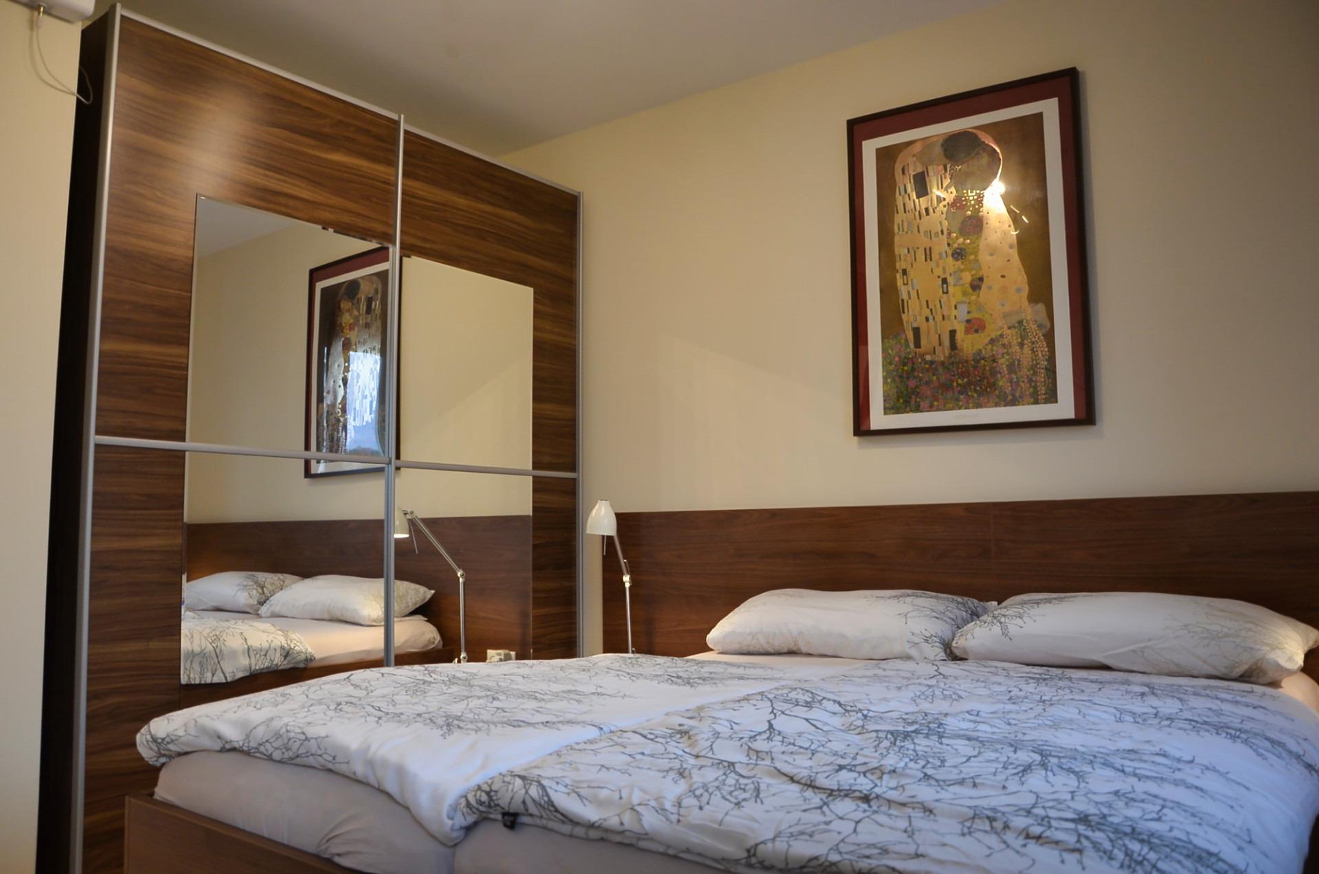 Das Doppelbett im Schlafzimmer 1 ist mit zwei Kaltschaummatratzen ausgestattet. Das Zimmer verfügt über einen Smart-TV sowie über einen großen Kleiderschrank. Das Schlafzimmer 2 ist mit einem Einzelbett, ebenfalls mit Kaltschaummatratze und einem etwas kleineren Kleiderschrank eingerichtet.