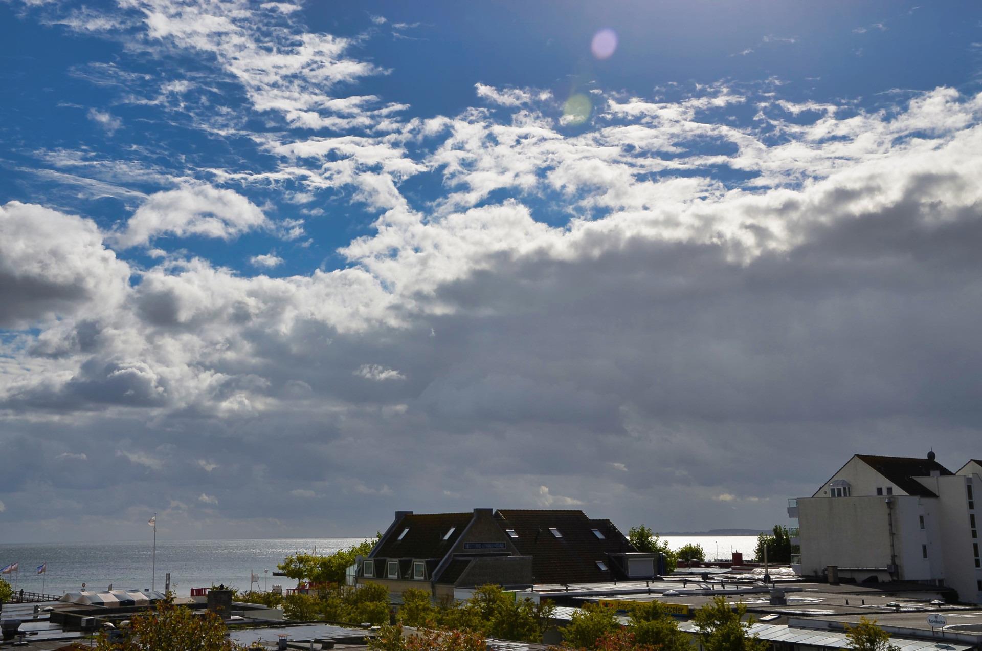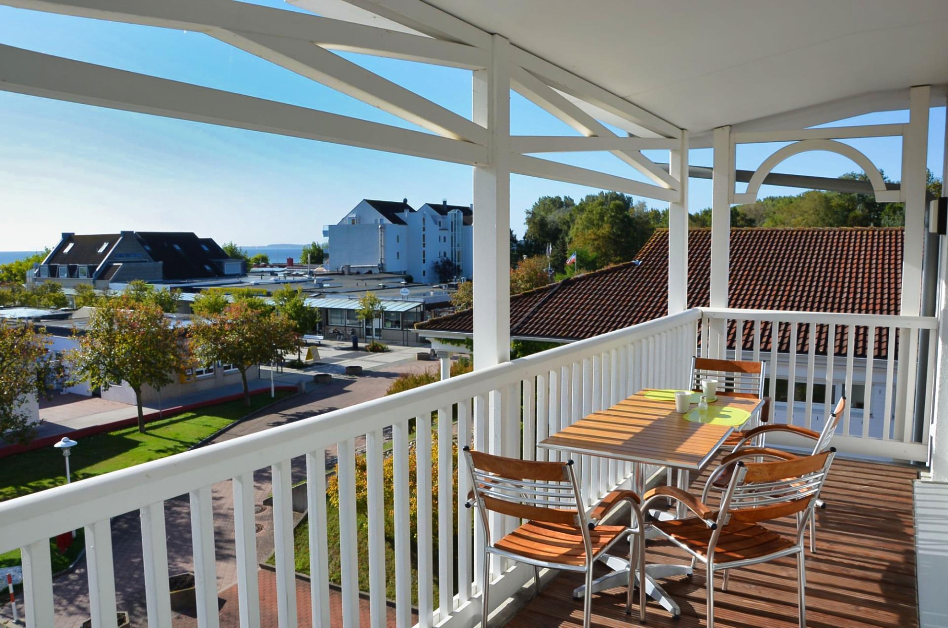 Vom Wohnzimmer gelangt man auf den großen Balkon, von wo man trockenen Hauptes auch bei starkem West- oder Ostwind bzw. Regen das Meer und den nur 50 Meter entfernten Südstrand erblicken kann.