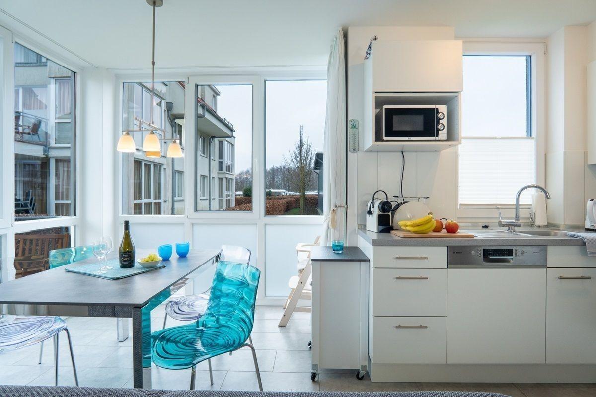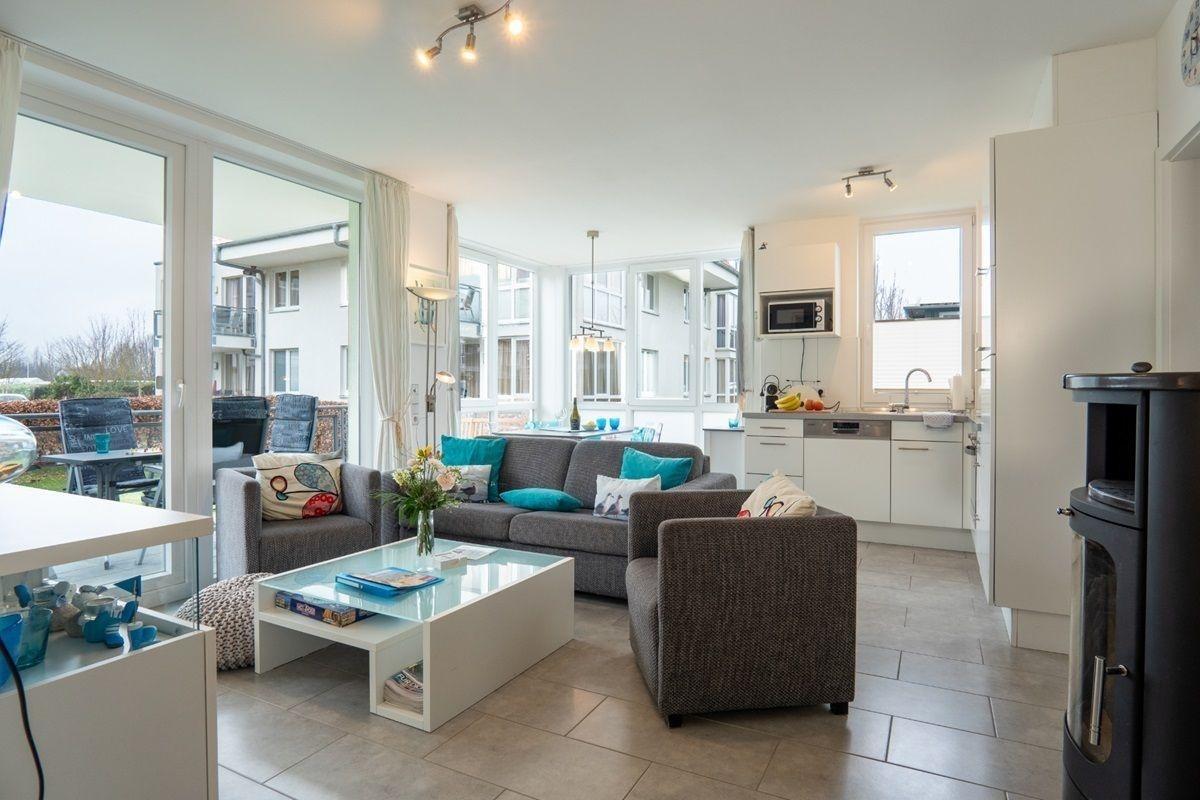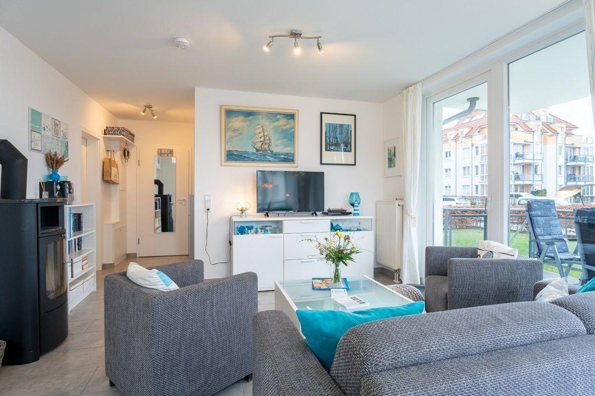 Die Wohnung verfügt über einen lichtdurchfluteten Wohnbereich mit einer gemütlichen Sitzecke mit Kaminofen, einer Essecke mit Blick ins Grüne und der angrenzenden offenen Küchenzeile. Vom Wohnbereich aus gelangt man auf die Terrasse, man kann die Ostsee schon riechen. Beide Schlafzimmer sind mit bequemen Doppelbetten ausgestattet.