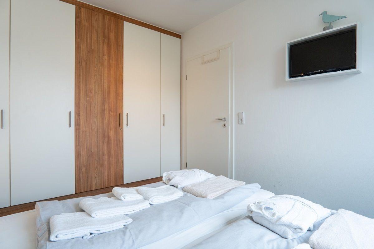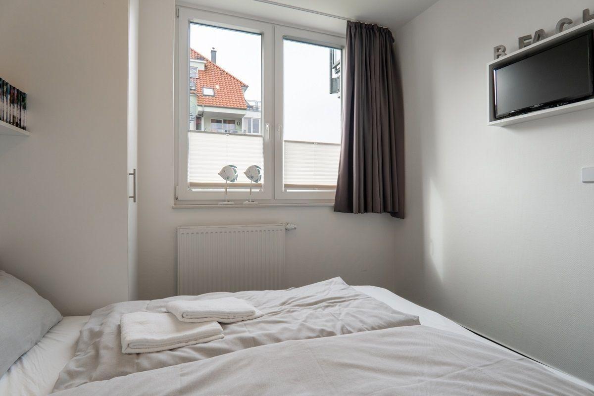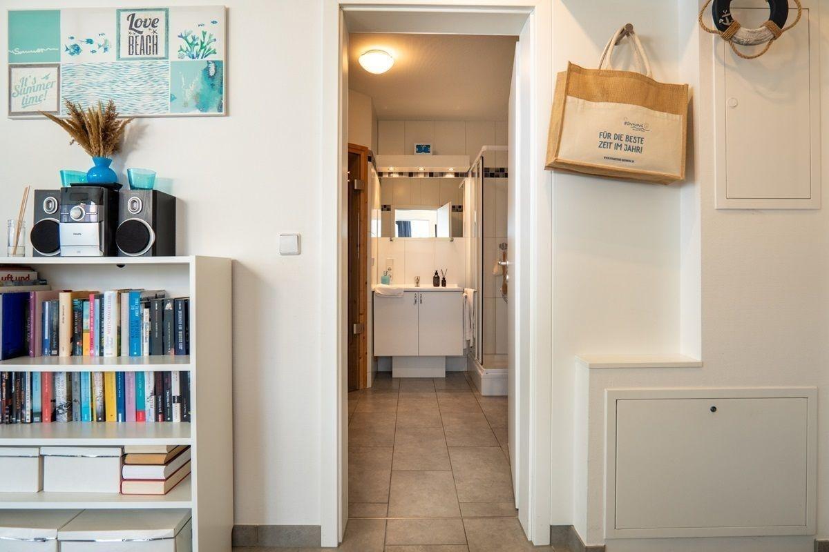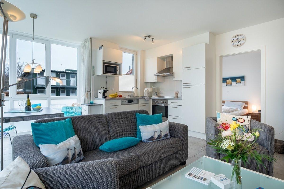 Die Wohnung verfügt über einen lichtdurchfluteten Wohnbereich mit einer gemütlichen Sitzecke mit Kaminofen, einer Essecke mit Blick ins Grüne und der angrenzenden offenen Küchenzeile. Vom Wohnbereich aus gelangt man auf die Terrasse, man kann die Ostsee schon riechen. Beide Schlafzimmer sind mit bequemen Doppelbetten ausgestattet.
