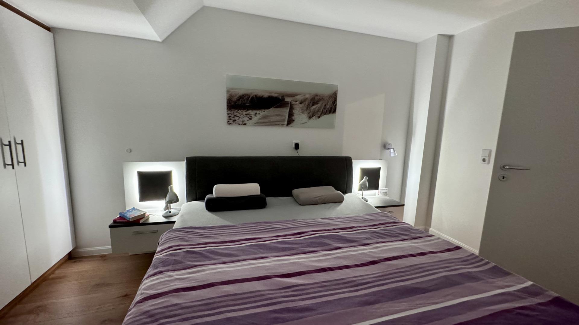 Bis zu 5 Personen finden auf 84 qm ausreichend Platz. Die Wohnung verfügt über 2 Schlafzimmer, die mit je einem Doppelbett und jeweils einem Smart-TV ausgestattet sind. Die 5. Person findet ihren Schlafplatz auf der orthopädische Schlafcouch (160 x 200 cm) mit einem orthopädischen Lattenrost im Wohnbereich.
