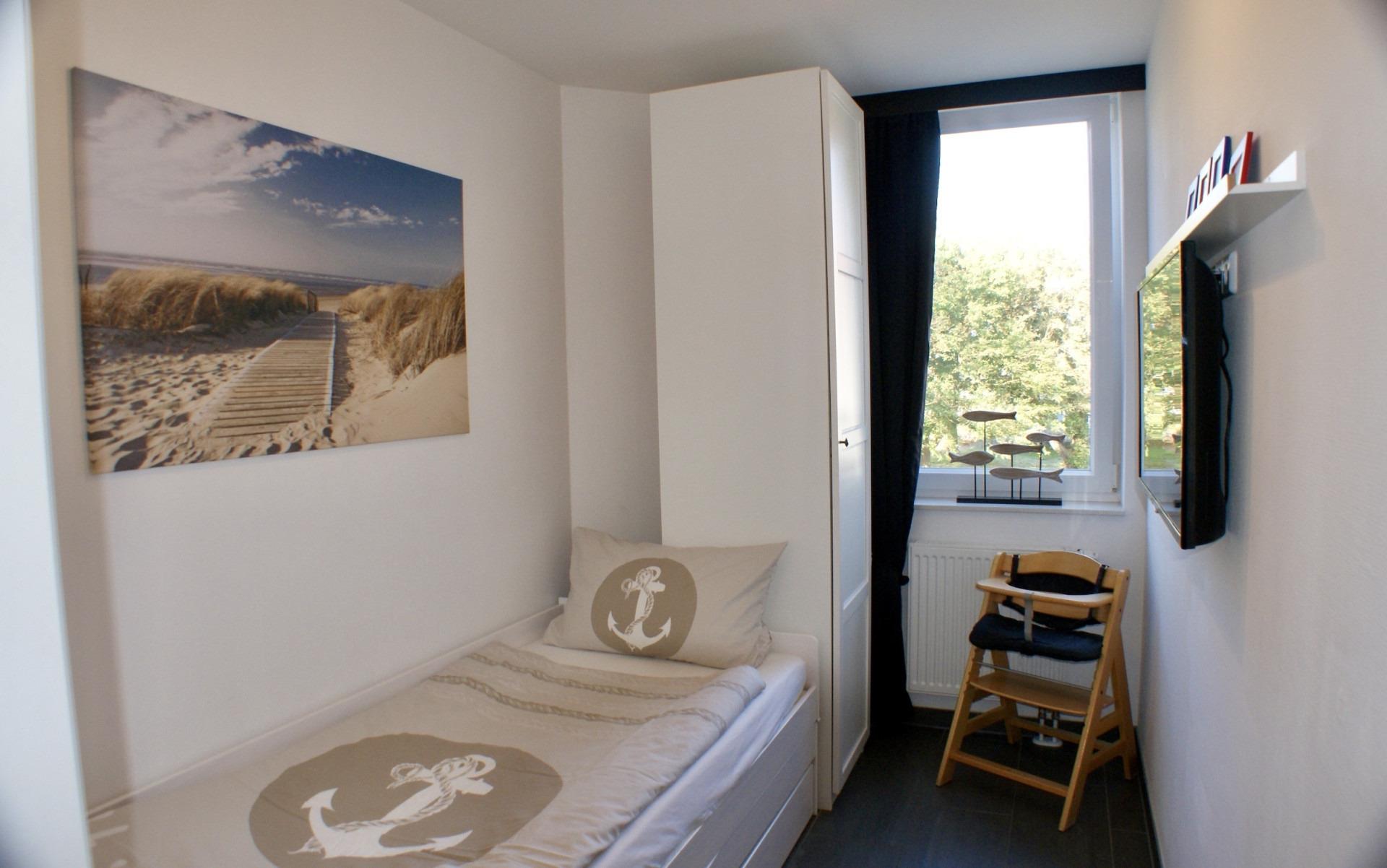 Die Ferienwohnung verfügt über zwei Schlafzimmer – Das erste Schlafzimmer ist ausgestattet mit Boxspringbett sowie einem Smart-TV. Das weitere Schlafzimmer mit einem gemütlichem Kojenbett, das auf gleicher Höhe ausgezogen werden kann.
