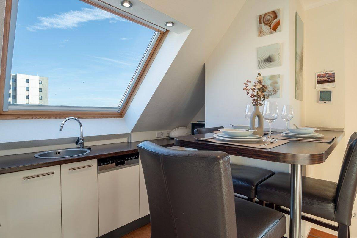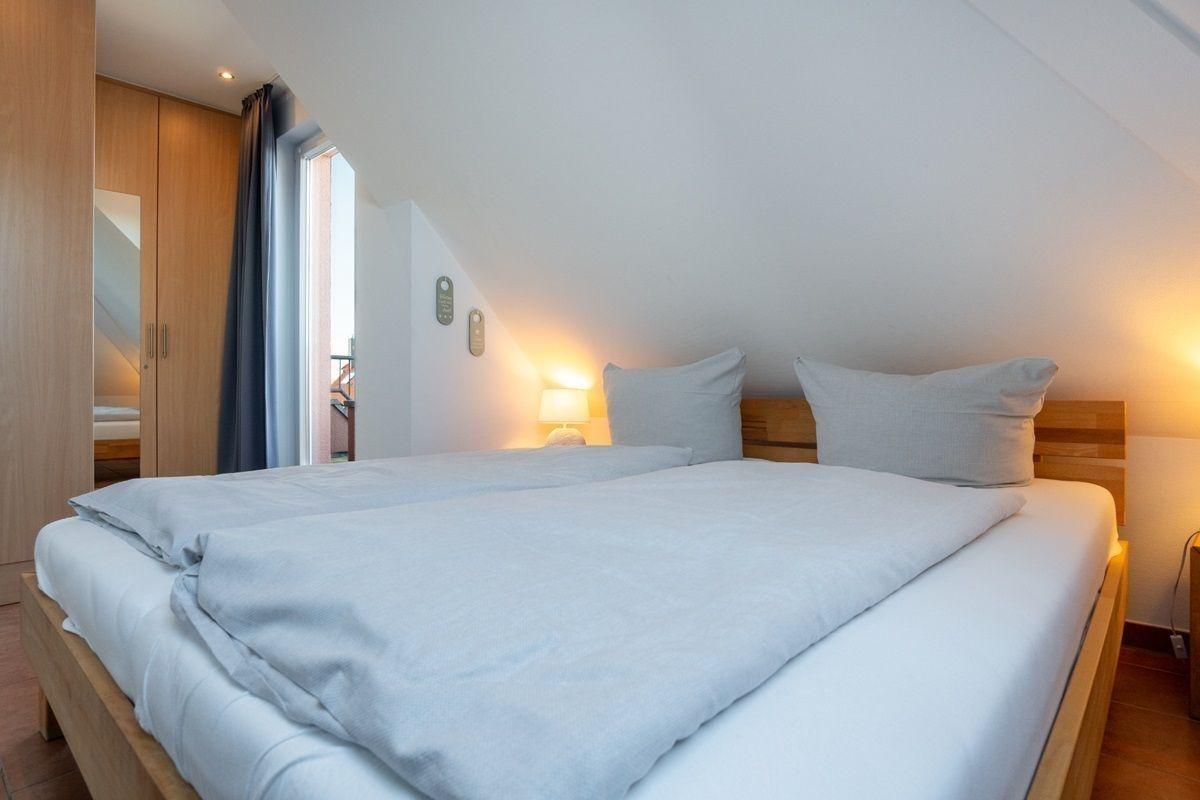 Die gemütliche Wohnung verfügt über einen lichtdurchfluteten Wohnbereich - aufgeteilt in eine TV-Ecke mit Sofa, Essecke am Fenster und einer Küchenzeile. Vom Wohnbereich aus gelangt man auf die Terrasse mit Süd-Ost-Ausrichtung - man kann die Ostsee schon riechen. Das große Schlafzimmer ist mit einem Doppelbett, Kleiderschrank, sowie einem eigenen TV ausgestattet. Das zweite Doppelbett befindet sich auf der Galarie, hier befindet sich der dritte Fernseher der Wohnung.