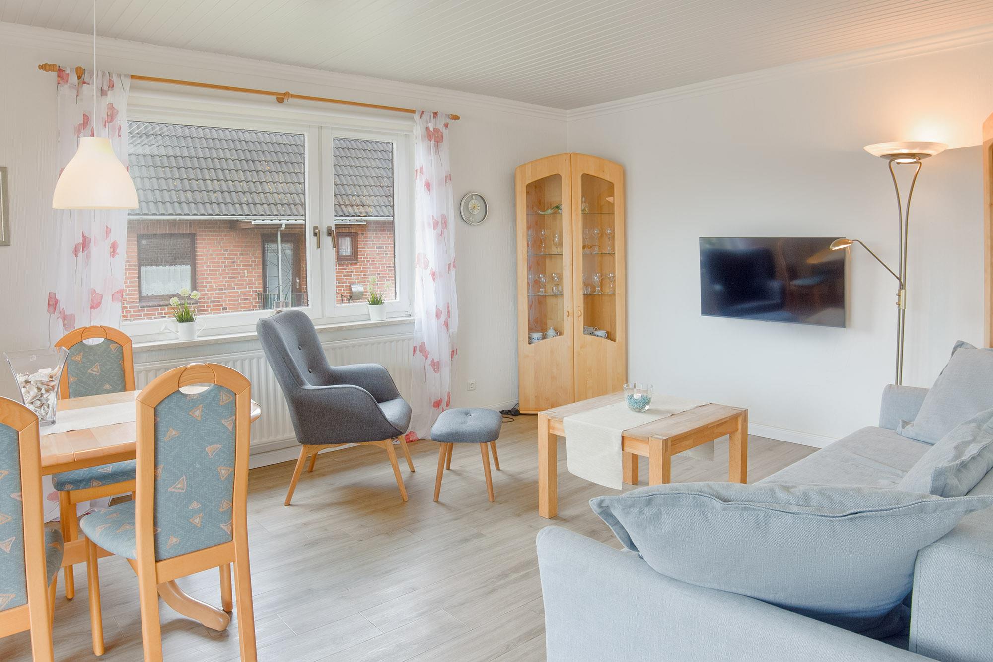 Herzstück der Wohnung ist der freundliche Wohn- und Essbereich, der mit wohnlichen Möbeln, einem LCD-TV sowie einem CD-Player ausgestattet ist. Der Laminatboden unterstreicht den modernen Charakter der Wohnung und sorgt für eine angenehme, pflegeleichte Atmosphäre. Hier können Sie nach einem erlebnisreichen Urlaubstag entspannen, gemeinsam essen oder gemütliche Abende verbringen.