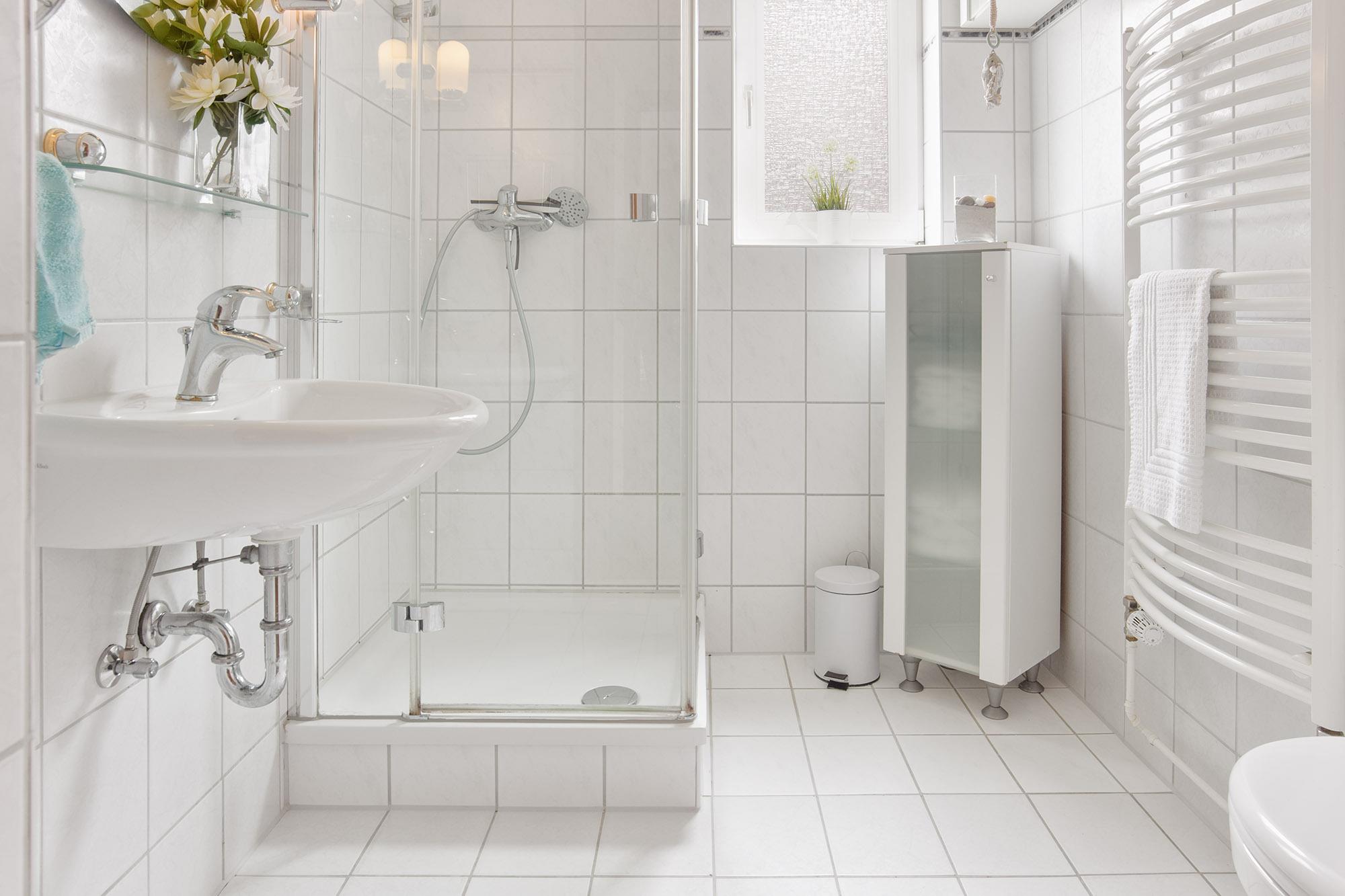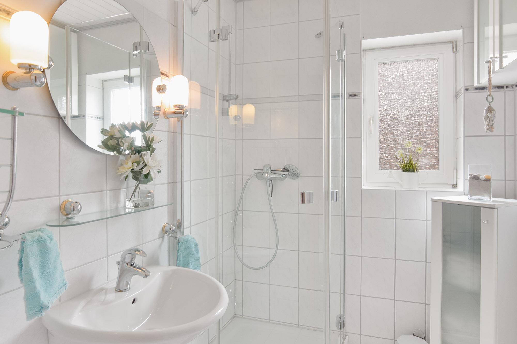 Das Badezimmer ist hell gefliest und modern gestaltet. Es verfügt über eine Dusche sowie einen Handtuchwärmer, der besonders an kühleren Tagen für zusätzlichen Komfort sorgt.