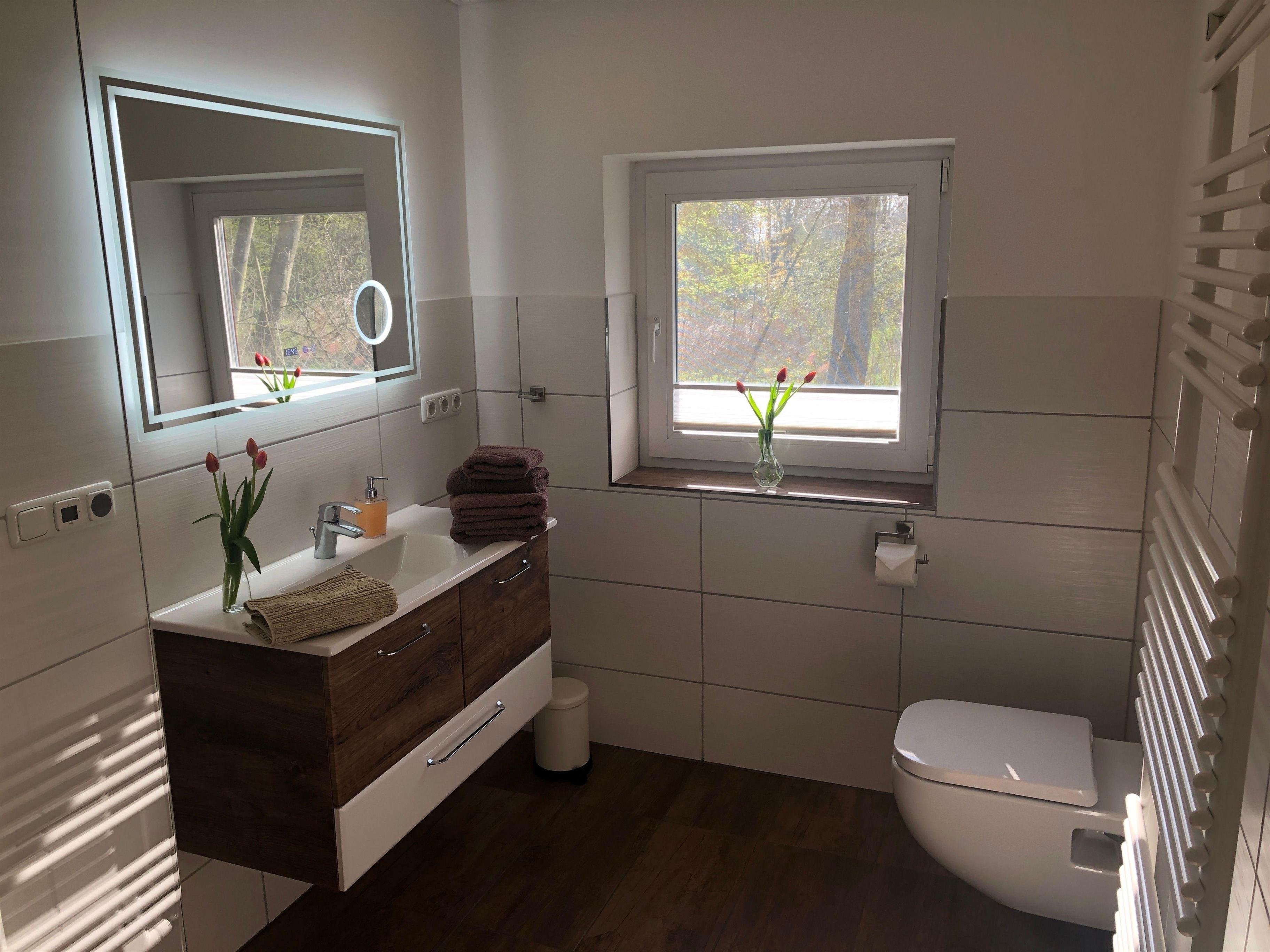 Das Badezimmer ist eine moderne Wohlfühloase mit einer großen begehbaren Regendusche (1,05 x 1,20 m).