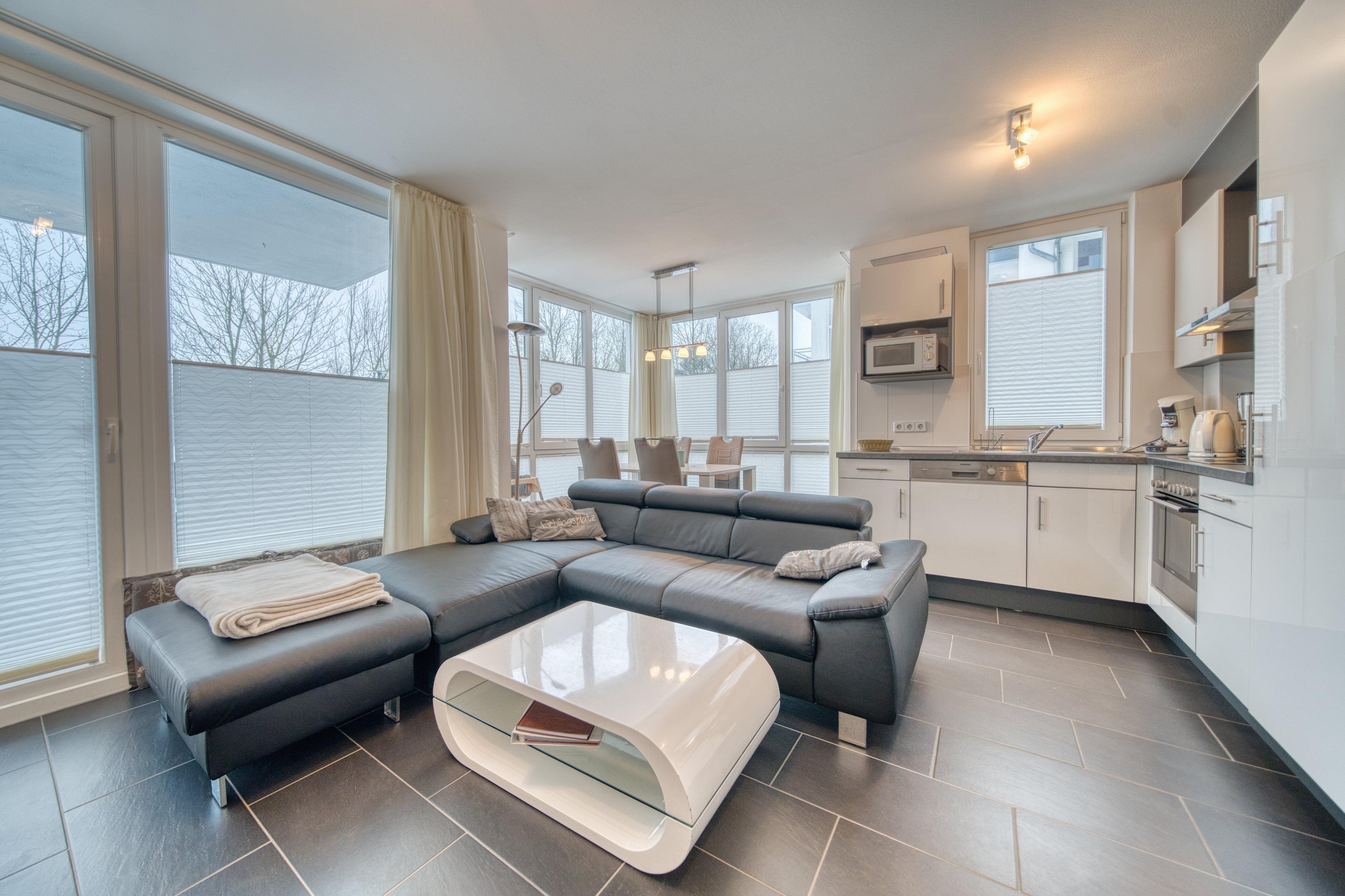 Großzügiges Wohn- und Esszimmer mit Ecksofa, Einzelsessel, Flachbild-TV (SAT), Blu-Ray-Player, Stereoanlage und Esstisch mit 4 Stühlen. Küchenzeile mit Herd, Backofen, Kühlschrank mit Gefrierfach, Geschirrspüler, Mikrowelle, Kaffeemaschine, Senseo-Padmaschine, Wasserkocher und Toaster.