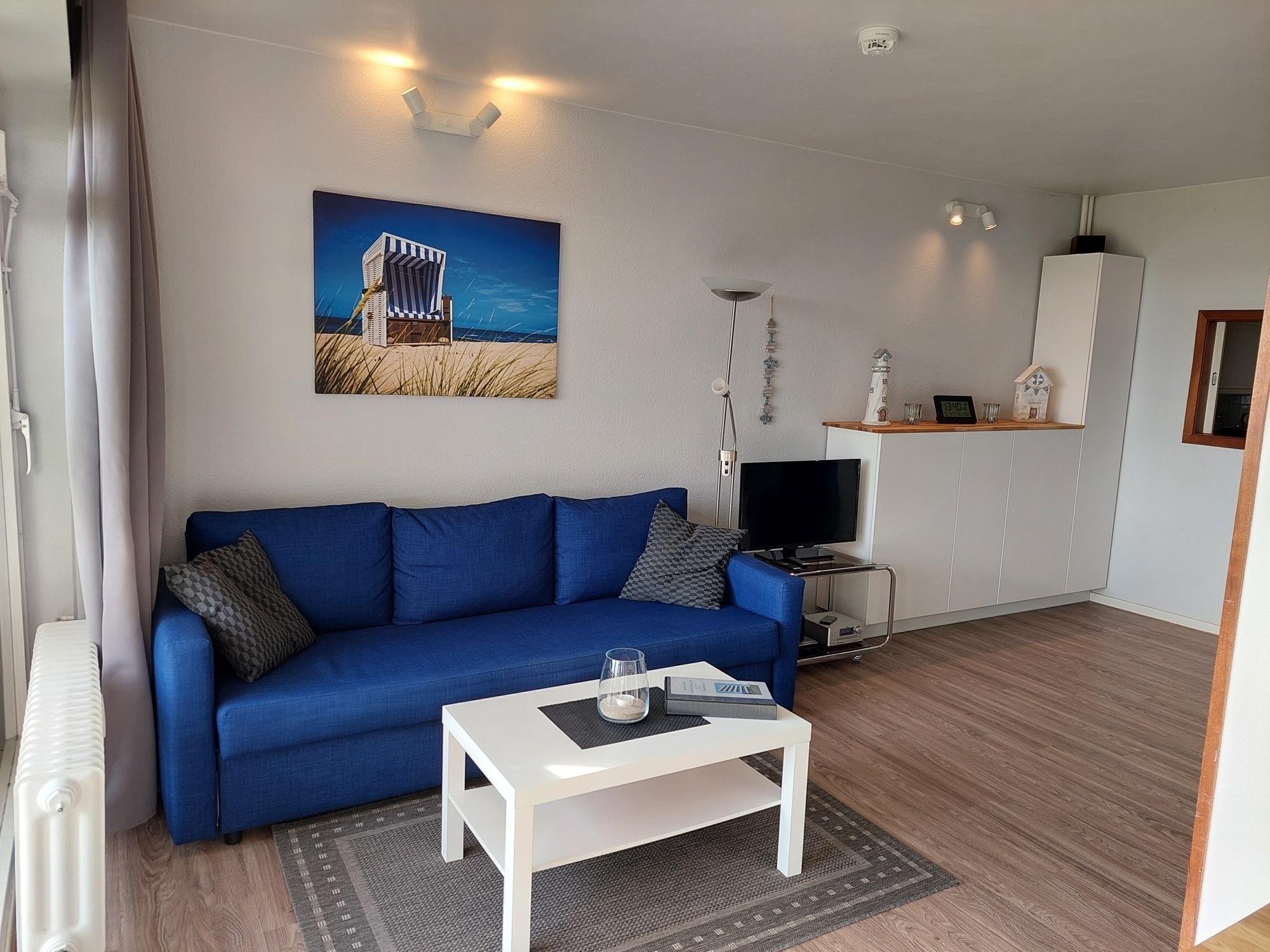 200 cm Doppelbett und Kleiderschrank. Im Wohnbereich steht ein Schlafsofa mit einer Liegefläche von ca. 130 x 200 cm, ein Flachbildfernseher, DVD-Player sowie eine kleine Musikanlage mit USB-Anschluss. Von der gemütlichen Eßecke können Sie direkt auf die Ostsee blicken. Die Küche ist voll ausgestattet inklusive Mikrowelle und Tchibo Kapselmaschine.
